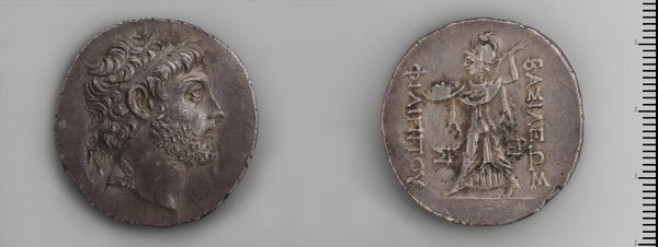 Curator: This is a Denarius, a silver coin issued by Julius Caesar in Africa. It's amazing to think this tiny object once held so much power and influence. Editor: It looks like it's seen things, hasn't it? The wear and tear give it a strange kind of beauty, like the map of a well-lived life etched onto metal. Curator: Absolutely. These coins weren't just currency; they were propaganda. Caesar put his image on them to project power and legitimacy across his vast territories. Think of it as ancient social media. Editor: The profile of Caesar—laurel-wreathed, of course—is so crisp, even now. And on the reverse, that figure—is that a representation of Africa? Curator: Indeed, Africa is depicted, along with Caesar's name. It served as a powerful message of his conquest and control over the region. Editor: It's a heavy thing, isn't it? That something so small could carry such weight of history, ambition, and even violence. Curator: It's a tangible link to a pivotal moment in history, a whisper from the past that still echoes today. Editor: Makes you think about all the hands it's passed through, all the stories it could tell if it could speak. A tiny, glittering time capsule.