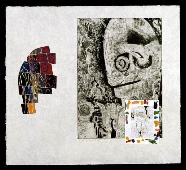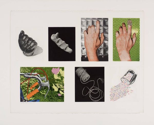 Editor: Joe Tilson's "Four Elements - Mudra," created in 1972, is a mixed media work that has collage and printmaking. I'm struck by the contrast between the colorful hand and the monochrome grid. How does the artist use these disparate elements to create a unified composition? Curator: Note how the grid provides a structural framework, grounding the organic forms of the hands. The handprints, along with the geometric arrangement of hand gestures, introduce a semiotic language. The color further divides the representation in the hand into separate elements. Editor: So, it’s not just about representation, but also about the underlying structure of meaning? Curator: Precisely. Tilson uses form and composition to explore the symbolic relationship between the hand and the four elements, with each element identified by color and textual description. Editor: I see. It's fascinating how the artist employs such varied elements to construct meaning. Curator: Indeed, by isolating and juxtaposing these elements, Tilson invites us to decode the underlying structure of his artistic language.
