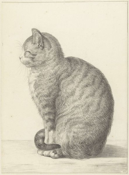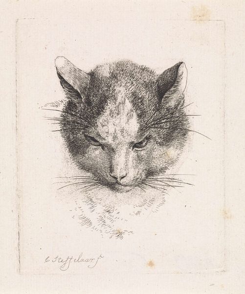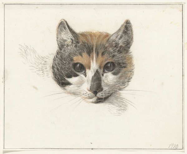 Curator: I’m immediately drawn to the delicacy of this pencil sketch. It’s a portrait, close up, of a cat’s head, almost symmetrical and very endearing. Editor: We’re looking at "Head of a Cat, Seen from the Front by Candlelight," made around 1812 by Jean Bernard, currently held here at the Rijksmuseum. It's rendered in pencil, as you noted. Thinking about the context, drawings like these offer a glimpse into the more intimate and informal artistic practices of the time, separate from large commissions. Curator: It is indeed charming. Look at the subtle variations in shading achieved with simple pencil strokes. The texture he coaxes from the medium makes the cat look almost touchable, yet there is no extravagance involved in its creation. Just a mastery of the instrument and its possibilities. Editor: Precisely, and I find it compelling to think about this piece in relation to notions of accessibility and artistic training during the early 19th century. Pencil drawings, in their relative affordability and ease of production, became popular among a growing middle class interested in artistic pursuits. What was the market like for these portraits, and who was commissioning this kind of work? It wasn’t academic, necessarily. Curator: That’s an interesting question. And perhaps one could ponder this piece through the lens of realism – an attempt to represent a domestic animal truthfully. But truth in art-making involves skill, the pencil and paper, and this artist’s individual perspective. These components contribute to our understanding of this particular work as an intersection of available media and technique. Editor: True, it makes me consider the evolving status of animals within bourgeois society and their depiction. Images of domestic animals become ever more ubiquitous as a symbol of a household's status. Curator: I find I return to the craftsmanship. To execute such detail with just a pencil requires profound control and patience. Editor: I'm left pondering this portrait as an interesting document in social attitudes toward animals during this period, but the real mystery involves figuring out the story that led to its creation. Curator: For me, its simple, material expression still conveys an affection that speaks directly across the ages.