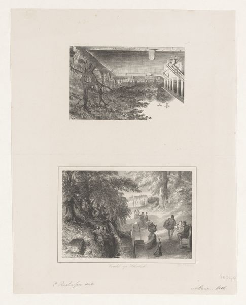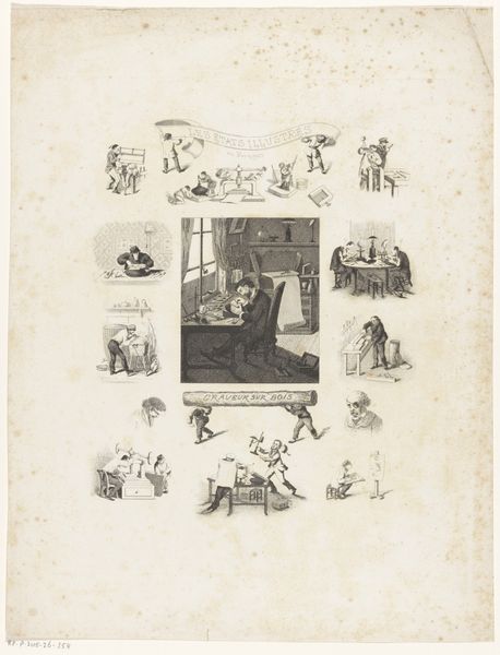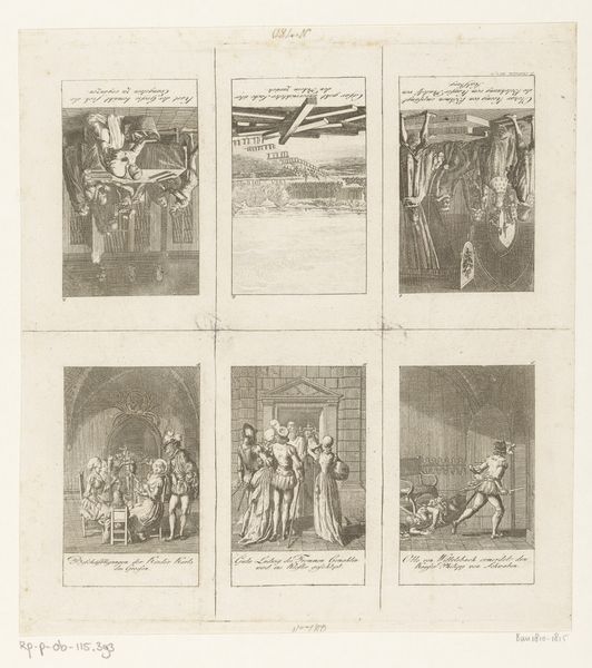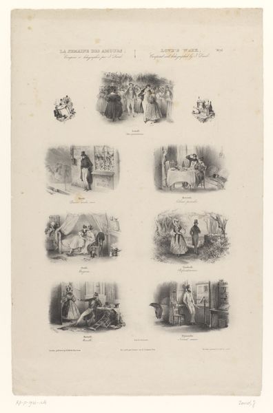 Curator: Today we're examining "Zes voorstellingen uit Madame Acker van Giavarni," created in 1842 by Charles Jacque. It's a pencil drawing on paper featuring several different scenes. What are your initial thoughts? Editor: My first impression is how it depicts societal expectations imposed upon women. It feels like a series of constrained narratives are presented here, each a tableau of feminine existence in the 19th century. Curator: That's a potent observation. Technically, the piece showcases Jacque's skill with pencil; notice the gradations of tone and subtle variations in line weight across the six distinct vignettes. He skillfully delineates form and creates depth within each scene, effectively utilizing the white of the paper for contrast and highlights. Editor: True, the craft is undeniable. Yet, I'm drawn to the stories the scenes hint at. In one panel, there's a woman seemingly pleading or praying with a dog at her feet. It suggests vulnerability and a reliance on faith and domesticity for solace. Another captures what appears to be a public shaming or punishment. Curator: Focusing on form again, notice the spatial arrangement of these narratives. The lack of a clear, unifying compositional element lends to a disjointed effect, creating a collage of disparate yet interconnected moments. This structure mirrors, perhaps, the fragmented experience of a woman navigating the societal demands of that time. Editor: Precisely. It prompts a critical examination of gender roles and the lack of agency afforded to women. Are we looking at societal pressures around marriage, piety, and public behavior? It all contributes to a complex picture of constraints. Curator: These concise, subtle portraits remind us of the artistic ability needed to convey depth through simplicity. This work functions beyond representation and invokes introspection regarding these characters and the period depicted. Editor: Ultimately, Jacque’s drawing provides valuable insight into the lives and limitations of women during the 19th century. The delicate execution doesn't diminish, but rather amplifies, the challenging realities portrayed within each frame.