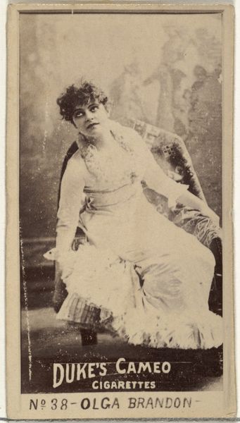 Editor: So, this is "Card Number 569, Hattie Dolaro," a portrait from the 1880s by W. Duke, Sons & Co., made with albumen print photography. It's an advertisement, which feels a little strange for something hanging in a museum. What can you tell us about its context? Curator: The albumen print, with its sepia tones and delicate detail, captures a specific moment in history. Consider how images of actresses were circulated: they weren't just portraits but vessels of aspiration, symbols of beauty and success readily consumed. Editor: Consumed in what way? Curator: These images tap into deep-seated desires, linking smoking, an increasingly popular habit at the time, with an idealized vision of femininity. What message do you think the manufacturers were hoping to send to consumers? Editor: That smoking Duke cigarettes can make you as alluring or successful as Hattie Dolaro, maybe? Or perhaps that these cigarettes are refined enough for sophisticated people who follow theater and culture? Curator: Exactly. The image carries social information; Dolaro’s dress, her pose, even the floral arrangements convey social standing and ideals. How does the card itself, being small and easily carried, become part of a broader cultural narrative? Editor: Well, the size makes it shareable, like a meme of the time, and the fact that it’s included with the cigarettes makes you hold on to the advertisement. I hadn’t considered how complex even a small advertising card can be. Curator: Visual symbols persist across time, adapting to new contexts while carrying echoes of their original meanings. Understanding these layered meanings unlocks fascinating insights into cultural memory.