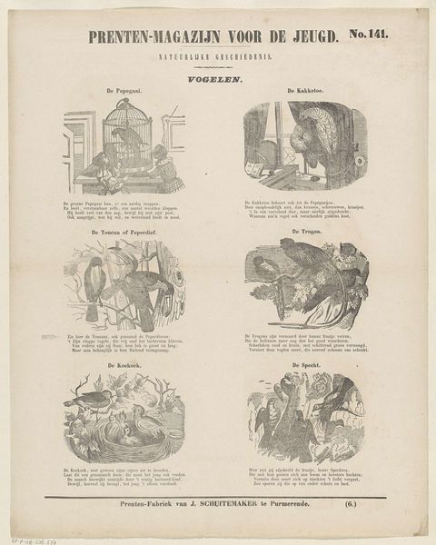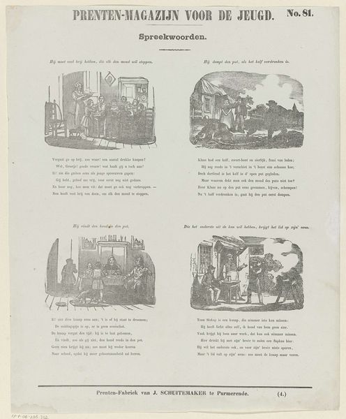 Curator: Editor: Here we have Jan Schuitemaker’s 1850 print, "Visschen," a Dutch engraving illustrating various ways of preparing herring. It’s almost like a diagram, a visual taxonomy of smoked and salted fish. What do you see in this piece? Curator: Visually, I am drawn to the stark contrasts in the engraving, which create distinct spatial relationships between the figures and the background. Notice how the composition in each vignette is meticulously framed. How does the formal arrangement of these frames across the entire sheet contribute to your understanding of the piece? Editor: It does give a sense of order. So, is it then more about the composition and less about, say, what these images tell us about Dutch society in the 1850s? Curator: From a formalist standpoint, our primary concern isn't with sociological readings, but with how the artist's choices in form and structure affect meaning. Consider how the print medium itself—with its limitations of line and tone—shapes our perception. Does the engraving’s visual language offer specific constraints? Editor: So it's about the visual elements creating a unique aesthetic experience. The textures created by the engraving and the shapes within the frames create rhythm. Is it really about this visual effect? Curator: Precisely. The success of the work hinges upon the artist's skillful manipulation of these formal elements. We’re engaging with the artwork on its own terms, isolating its aesthetic components. Editor: I now recognize that the charm and meaning stem not just from the content of the illustrations but how the layout conveys a message that stands alone. Curator: An excellent observation. The materiality of the engraving, its precise lines, combined with the ordered grid, presents a fascinating visual puzzle, resolved through close observation and aesthetic appreciation.