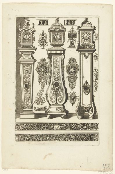 Editor: Here we have Johann Theodor de Bry’s "Design for a Knife Handle with a Scene from the Book of Tobit," created sometime between 1580 and 1600. It's an engraving. My first impression is one of intricate detail. The narrative scene and the ornamental flourishes feel so meticulously rendered. How do you interpret this work and its imagery? Curator: Indeed! Notice how the primary scene is framed within the functional design. This embedding isn't accidental. The story of Tobit, itself concerned with healing and divine intervention, is consciously interwoven with everyday life. The image itself functions almost like an amulet, carrying meaning beyond mere decoration. What do you make of the placement of the cherubic figures around the central image? Editor: They give it a heavenly feeling, raising it to a spiritual plane. Like a blessing over the story represented. Curator: Precisely. They introduce an emotional quality of reassurance. These visual cues invite contemplation. And consider the recurring motif of hybrid creatures and foliage; what meaning could that convey? Editor: Perhaps the fusion of different elements implies transformation? Or a world constantly in flux, mirroring the challenges Tobit faces. Curator: Exactly! The symbols reflect both the perils and the promise within the narrative. Through form and subject matter, the designer has created something greater than the utility it serves. The design, a fusion of biblical narrative and domestic life, tells the stories held within domestic objects. Editor: This was really enlightening! I've gained such a deeper understanding for the layers of meaning woven into even utilitarian objects.