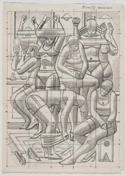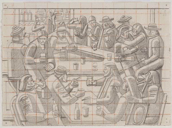 Curator: Immediately striking is the geometry of this pencil study. The sharp angles and regimented forms lend a certain stoicism. Editor: This is a study by William Roberts, dating from 1975, for a work titled 'Sending-in Day'. It's part of the Tate collection, measuring about 12 by 17 centimeters. Roberts, born in 1895, was deeply invested in portraying working-class life. Curator: Seeing the figures so uniformly depicted, bearing artworks themselves, I’m reminded of how cultural production often depends on unseen labour, on the collective effort of those who install and transport art. Editor: Absolutely, and the visual structure underscores that point. There is a cubist influence, but it's softened by Roberts's social realist perspective. The grid, visible beneath the sketch, is essential, providing a framework for an entire system. Curator: Yes, a system where each figure, each artwork, plays a role within a larger narrative of display and access. It prompts questions about who gets to participate in art and who is excluded. Editor: Ultimately, the drawing offers insights into the relationship between art, labor, and social structures. Curator: A fitting reminder of the many hands that shape our experience of art.