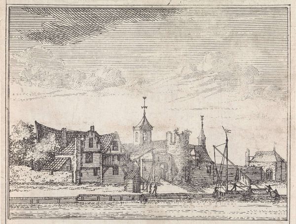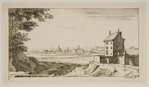 Editor: Karel Dujardin's "Town on a Mountain," is a detailed etching. The way the town sits perched atop the hill creates a sense of serenity. What enduring symbols can we unpack from this detailed scene? Curator: Notice how the town, with its church steeple, is elevated. This placement isn't accidental; it visually reinforces the church's dominance, linking the earthly town to the heavens. What cultural memory does this evoke? Editor: It suggests a society where religion and community are intertwined, literally at the highest point. Is the town's isolation significant? Curator: Precisely! The mountain acts as a barrier, creating a self-contained world. Dujardin seems to be exploring the psychological safety and, perhaps, the limitations of such a protected space. Editor: That makes me see it in a completely different light! Thanks. Curator: My pleasure.