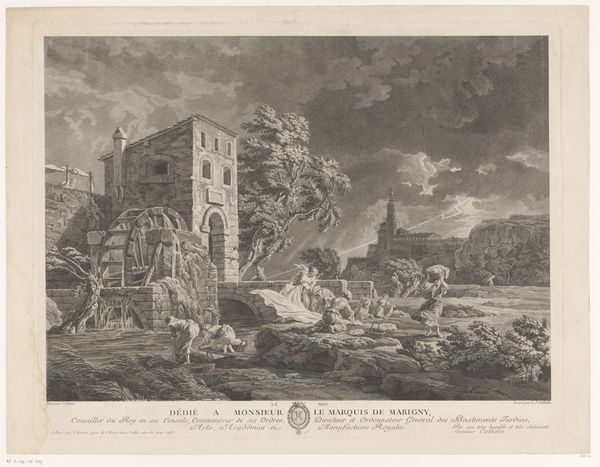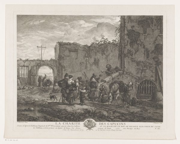 Jean Moyreau created this print, "Reizigers bij een smid," using etching. We're invited into a scene bustling with activity, set against the backdrop of what seems like a village smithy. In this era, the lives of common laborers were seldom the subjects of art. Yet, Moyreau turns his gaze to the everyday, to the figures who toil and travel. What does it mean to center these individuals, these lives that often existed on the periphery of societal attention? How did the act of depicting them shift the power dynamics inherent in art? These travelers aren't merely passing through, they're claiming a space within the narrative. Moyreau is asking us to consider who gets to be seen, whose stories get told, and whose experiences are valued. He challenges the prevailing norms of his time by directing our attention to those laboring. He makes visible the lives that often go unnoticed. It’s a quiet revolution, rendered in ink, asking us to reconsider the landscape of representation.