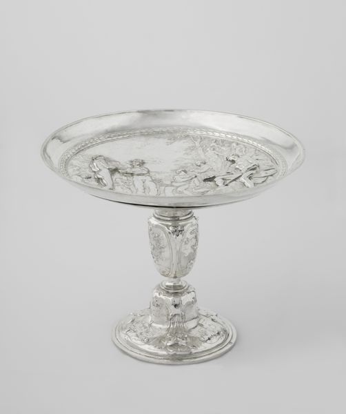 Editor: Here we have a dazzling, footed drinking cup, known as a Tazza. It's silver, crafted around 1602 by Aelbert Verhaer. I am immediately struck by its ornamental style, like something out of a fairy tale, fit for ambrosia. What exactly are we looking at here, thematically? Curator: Oh, it’s more than a mere cup; it's a glimpse into a world of gods and myths! Imagine, a Renaissance party, where this extravagant display embodies prestige, knowledge of classical themes, and pure indulgence! Verhaer presents the Olympian Gods. Can you detect any characters? What sort of feelings do they inspire? Editor: Well, with all those intricate details, I mostly feel overwhelmed. Gods feel pretty remote to me… I recognize... Neptune, maybe? So much detail... What was the process for making something like this? Curator: That’s an excellent question! Verhaer wasn't just a metalworker; he was a storyteller in silver. It would have been formed and shaped before adding chasing techniques – hammering the design from the reverse, allowing the figures to 'pop' out with striking relief and bring the narrative to life. A bit like bringing ancient stories to life, wouldn’t you say? The reflection in the silver makes it more like peering into a pond to glimpse these stories. Editor: That makes so much sense. It’s less like a still image and more like a performance. I suppose, back then, knowing your Greek mythology was part of knowing how the world worked. Now I need to study my Ovid! Thanks. Curator: Indeed, think of this "Tazza" as a testament to a bygone era. A conversation piece, and an artistic dance between opulence and erudition! The craftsmanship is magnificent.