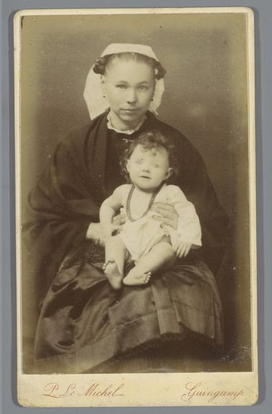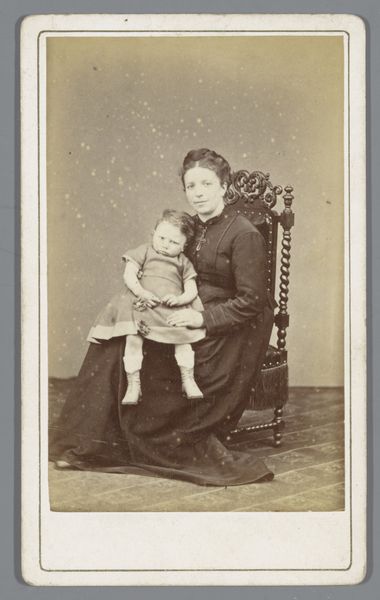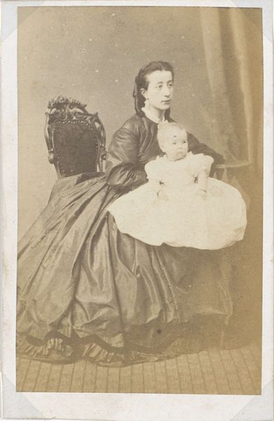 Editor: This is a photographic portrait from between 1870 and 1890, currently housed in the Rijksmuseum. The artist is Heinrich Wilhelm Wollrabe, and the title translates to “Portrait of an unknown Indonesian nursemaid… with baby on her lap.” It has such an intimate and yet distant feeling. How do you read the symbols present in the picture? Curator: That distance you perceive is significant, because photographs from this period become charged objects, capturing both the sitter's presence and a complex colonial relationship. It makes you wonder about the unnamed sitter – her cultural context and lived experience – and how that intertwines with the symbols and details around her. For example, look at her batik sarong, the specific patterns probably signified her region or social standing. The carefully carved table suggests a certain level of imposed Westernization, and consider how the baby's Western-style clothing contrasts with the woman's traditional attire. Editor: So the juxtaposition of Western and Indonesian elements creates meaning? Curator: Precisely! It is a dialogue of cultures – a visual record laden with the complexities of power dynamics. Even the simple act of taking the photograph, the way she's positioned, and the baby's posture, all tell stories about status, ownership, and cultural exchange in colonial Indonesia. The photograph operates almost like a cultural artifact preserving history. Editor: It's amazing how much a single image can convey. I will definitely spend more time observing the symbols. Curator: Indeed. This photograph invites us to contemplate whose story is being told and whose is being overlooked. What do you see it representing in the 21st century?
