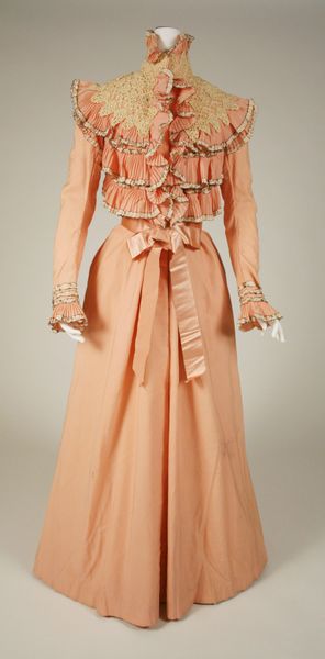 This ensemble was made by B. Altman & Co., a New York-based department store that operated from the late 19th to the late 20th century. The design of the jacket points to the ways European fashion trends were translated and consumed in the United States. With its high collar, fitted waist, and rows of buttons, the jacket evokes military styles popular in Europe, yet it also speaks to the rise of consumer culture in America, where department stores like Altman's played a key role in shaping taste and desire. Consider how the department store itself was a social institution, one that catered to a growing middle class, particularly women. Stores offered not just goods but also a space for leisure and social interaction. Fashion, in this context, becomes a form of self-expression but also a marker of social status. To understand this piece better, we can look at archival materials like store catalogs and advertisements, which tell us about the values and aspirations of the time. Fashion is never just about clothing. It's about the complex interplay of culture, commerce, and identity.