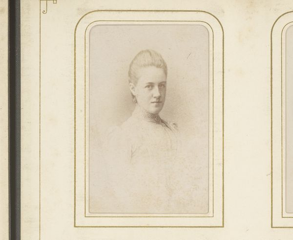 Curator: This photographic portrait, believed to be made between 1866 and 1890 by Brandebourg & Rissé, presents us with a glimpse into the life of an anonymous woman. It appears to be a daguerreotype. What's your immediate response to her image? Editor: My first impression is one of quiet resilience. Her gaze is direct, yet there’s a vulnerability in the set of her jaw. The tones are subdued, almost ghostly, creating a somber atmosphere. Curator: Indeed, photography in this era held significant cultural weight. This portrait, like many others, would have been carefully constructed to convey specific messages about the subject's social standing, character, and values, perpetuating certain ideals, especially relating to gender and class. Editor: And the inherent limitations of early photography—the long exposure times, the specific lighting—likely played a role in shaping that constructed image, reinforcing established gender roles. How much agency did she really have in crafting her representation? We must consider her access to resources and societal constraints. Did the photographers have any particular politics in representing this woman, for example? Curator: The absence of flamboyance or overt markers of status makes me wonder whether we're looking at someone outside the traditional elite. The simple dress and somewhat severe hairstyle point to an aesthetic less concerned with conspicuous consumption. Could her very existence captured in photographic form be an act of subversion, or, at least, participation? Editor: That’s an interesting proposition, to consider a woman who's not from a socially empowered milieu who may be attempting to exercise whatever power she can within societal structure and norms, as fragile and restrictive as they are. Also the physical framing and material matter. It's clearly a display image of importance as part of its framing. What messages might be gleaned in its display within a home for family, friends, visitors to view? Curator: Well, regardless of its context and reception at the time, what the piece brings forth today is her very individuality. That to me is powerful in light of this individual potentially confronting the rigid structures she has in fact, and for me her spirit seems very present today. Editor: I agree, absolutely. Looking beyond its historical trappings allows us to imagine the person, rather than just the product of a particular time and photographic tradition. And maybe find the strength in silence and resilience she expresses through her image.