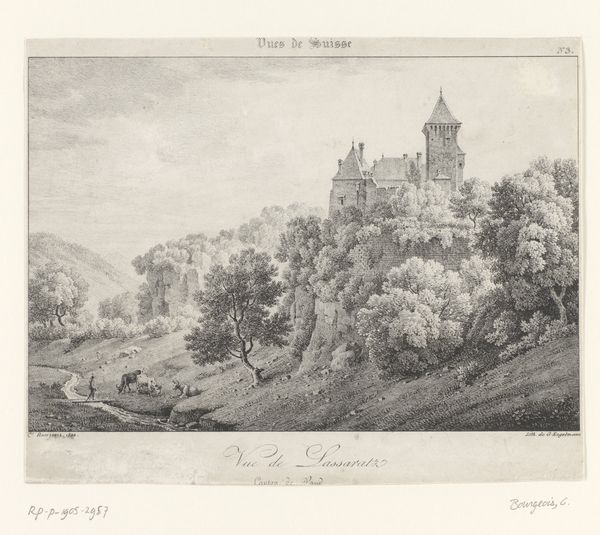 Curator: This is "Gezicht op La Voulte-sur-Rhône," an etching and engraving created around 1854. What's your first impression? Editor: Austere, almost... cold. The linear quality and the stark contrast give it a sense of distance, despite the bustling figures in the foreground. Curator: It's a view of the town itself, really an imagined reconstruction focusing less on realism and more on capturing the town's identity and socio-economic place on the riverbanks. Look at the boats – signs of trade and commerce. Editor: Absolutely, but the artist also utilizes line weight masterfully. Thicker lines define the foreground, anchoring the boats, while the town recedes into finer, lighter marks. This dictates the sense of spatial depth, using only tonal value. Curator: Right. Consider the economic forces at play during this era, think of the labour behind creating and trading such prints; how were these images circulated, and consumed, influencing the public's perceptions of place and identity? Editor: All true, but I'm equally struck by the visual vocabulary. The deliberate cross-hatching generates texture suggesting stone, water, even foliage, through purely abstract means. How this conveys visual information independent of what the reality would look like to the eye. Curator: Yes, it points to larger economic realities and how the artist uses the industrial methods available at that time to reach wider audiences. It's about the act of disseminating views like this that informs us more broadly. Editor: Perhaps. Still, that interplay of dark and light—it directs the gaze, creates dramatic highlights on the architecture, that's all fundamental visual story-telling. Ultimately it makes for a pretty memorable piece. Curator: Exactly. A compelling, useful window into a moment of industrial production and material transformation within a certain landscape. Editor: I find it truly revealing how close observation can generate divergent conclusions.