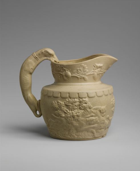 Editor: Here we have a pitcher created sometime between 1832 and 1839 by the American Pottery Manufacturing Company, currently residing at the Art Institute of Chicago. It’s crafted from ceramic, and what strikes me immediately is the uniform, almost sculptural quality, like a solid block of carved material rather than a functional vessel. What catches your eye about it? Curator: Its monolithic appearance is indeed compelling. Notice how the artist employed a complex design of relief decorations to cover the entire surface of the ceramic vessel. These textured surfaces create an interplay of light and shadow, altering our perception of its form. The symmetrical balance also contributes to a unified viewing experience. The handle’s shape and ornamentation, echoed across the piece, establishes a pleasing harmony. Editor: So you’re seeing it as an exercise in form and balance, rather than as just a useful object? Curator: Precisely. Let’s examine how the vessel’s silhouette is a key element, the curved spout drawing your attention to its volume and functionality. Yet the applied reliefs create a secondary layer of visual complexity, transforming the pitcher into something more than merely utilitarian. The relationship between these levels, of shape and texture, creates an art piece. How would you characterize the impact of the handle's scrolling design? Editor: I think the scrolls soften the geometrical form. Without them it may seem stark, uninviting almost. Curator: The contrasting curvilinear features underscore the interplay of organic versus geometric structures, which generates the tension so essential in art, regardless of epoch. Editor: It is amazing to view it as something beyond functionality. It makes me appreciate the attention to detail so much more. Curator: Exactly! Observing how the manipulation of line, texture and form elevates the piece, from functionality to aesthetic sophistication, provides insight into art in daily objects.