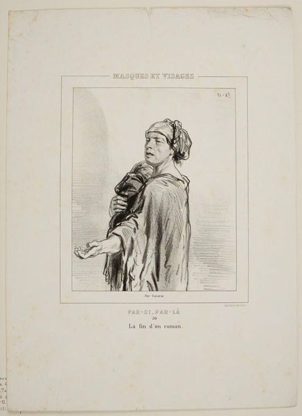 Editor: This is Paul Gavarni's "The Hunt for the Autograph." The woman in the image looks a bit melancholy, leaning against what looks like a window frame. I'm struck by the title—what do you see in this piece? Curator: The image speaks to the commodification of celebrity culture, even in Gavarni's time. The woman’s pursuit reflects a deeper societal pressure on women to engage in social rituals, to collect and display these "trophies" of access. How might this pursuit of autographs reflect broader gendered expectations? Editor: So, it's not just about getting an autograph, but about the social pressures behind that? Curator: Exactly. It reveals the complex interplay between personal desire, social obligation, and gender roles within the evolving landscape of fame. This definitely gives me a lot to think about.