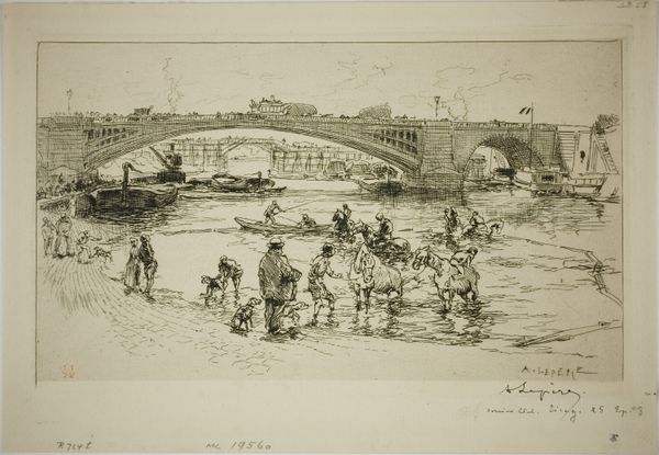 Curator: This is Auguste-Louis Lepère’s “Woodblock for Lock of the Canal Saint-Martin,” likely created between 1890 and 1910. It resides here at the Art Institute of Chicago. Editor: It feels quite stark at first glance. The high contrast really jumps out. There's a strong diagonal created by the pulling figures at the bottom, contrasting with the arch of the bridge above. Curator: The bridge functions as an enduring emblem of connection, a stable element, especially contrasted to the flurry of industrial activity smoking on the skyline. I find it revealing about the social dynamics and progress of the period in France. It's a society visibly transforming and adapting. Editor: It's a very effective piece of engraving! Look at how he uses line to differentiate between textures and distance, suggesting atmospheric perspective through the density of strokes. There is realism here in portraying daily life, but the arrangement is deeply strategic in its visual impact. Curator: I see this industrial development in relation to individuals: from those scaling the architectural marvel to those working in service of the city. The hats could represent aspirations or restrictions; a rigid societal hierarchy in an era of progress. Editor: It certainly emphasizes the class distinctions! You've got the working class right in the foreground pulling some sort of lock system. There are almost theatrical costumes for figures in the background. It shows in its depiction how new engineering endeavors change urban structures, creating entirely new modes of circulation. Curator: The woodblock aesthetic gives the image a particular weight. Each carved line holds so much intent. The textures create a strong representation of a period's identity. It echoes the radical political ideologies fermenting throughout that era. Editor: Indeed, it all blends into a cohesive symbolic narrative! The visual relationships tell an exciting tale and leave one questioning what transformation can lead to, in society, but also visually.