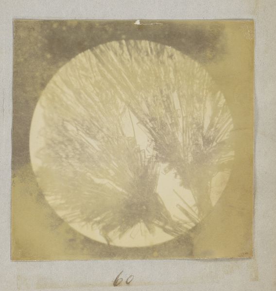 Curator: What an odd little gem! At first glance, I see this grainy orb surrounding an oddly compelling, almost architectural structure. It's like peering into some microscopic cityscape. Editor: Well, you’re not far off in sensing its diminutive scale. This gelatin silver print, made sometime between 1887 and 1888 by Marinus Pieter Filbri, presents a sixty-times magnified microscopic view of sodium chloride—table salt. Curator: Fascinating. Immediately I'm thinking about colonial histories, about how salt, seemingly mundane, has driven entire economies and brutal systems of labor. Salt as a source of power and control. Editor: Exactly! Think about its role in preserving food, enabling long sea voyages, and shaping trade routes. This image, a technological marvel of its time, invites us to reflect on how materials shape societies. What looks like a mineral is not exempt from being part of networks of class, capital, and production. Curator: And consider the artistic choice to capture it. It’s not merely a scientific document; there’s an aesthetic decision to frame it, to present it as something…beautiful. It transcends objective representation. Editor: I agree. The contrast between the defined crystalline structure and the surrounding grainy field enhances our understanding of matter itself. Each print had to be made with skilled, precise hands, of course, drawing attention to how a technology relies on often-unseen labor. Curator: Thinking about the labor of creating this gelatin silver print and the labor in salt mines—often unseen, underpaid, and historically marginalized… It is a potent reminder that seemingly disparate aspects of society are deeply interconnected. Editor: Definitely, it challenges this false hierarchy we create separating fine art from craft and also sheds light on often exploitive industry. Curator: Well, I think I'll never look at salt the same way again. This simple object unveils such layers of social complexity. Editor: Indeed. Filbri’s image reveals that there is extraordinary beauty, depth, and even a latent social history embedded in the stuff we take for granted.