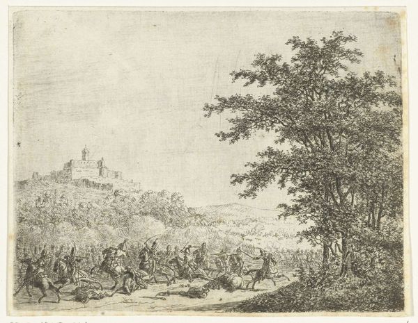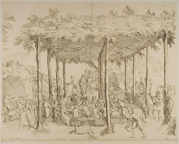 Curator: Looking at this delicately rendered etching in ink, aptly titled "Festival in een park", or "Festival in a Park," dating from approximately 1665 to 1675, one is immediately struck by the sheer busyness of the scene. Editor: Yes, it’s a flurry of lines, creating a wonderful sense of airiness and light despite the detail. The composition is fascinating, almost divided in two by the open space in the middle ground. There's an incredible contrast between the figures grouped on the left and those on the right, all unified by the landscape, almost Baroque in sensibility. Curator: It’s important to remember that Jan Fouceel, the artist, was working in a period heavily influenced by courtly life. Etchings like these circulated widely, effectively democratizing images of aristocratic leisure. The park itself was a curated space for social performance. Editor: Agreed, the artist meticulously builds spatial depth with the faintest of lines, yet those classical statues almost compete with the figuration. But look how Fouceel uses those delicate lines to imply texture – the rustling leaves, the rich fabrics… it's exquisite. Curator: I'd add that the genre scene is not merely a record, but perhaps a gentle commentary on societal rituals. The etching's popularity would have been linked to its representation of a lifestyle to which many aspired, revealing tensions within Dutch society at that time. Editor: Fascinating, considering how the eye dances across the artwork, landing momentarily on each figure, piecing together small stories within the larger tableau, making effective use of varied mark-making for interest and directing focus.. The etching’s beauty resides precisely in the way its formal elements collaborate to deliver not just visual data, but palpable feeling. Curator: Exactly. Reflecting on "Festival in a Park", we witness the interplay of social aspiration and artistic technique; a mirror held up to a specific moment in Dutch history and experienced through Fouceel’s artistry. Editor: Indeed, and that is where art like this becomes truly captivating - when an etching's lines translate historical context into the aesthetic delight for the viewer.