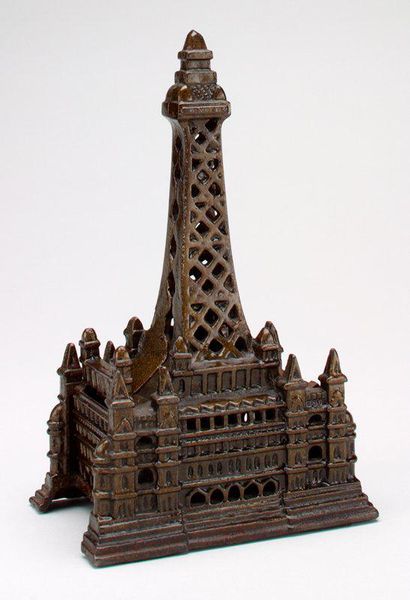 Editor: So, this is "-Flatiron Building Bank" made around the 1900s by Kenton Hardware Manufacturing Co. It's metal, meant to look like the Flatiron building in New York City. I’m struck by its weight and texture...almost a tarnished, aged feel despite being a replica. What do you see in it? Curator: I see more than a simple architectural model. This object carries the weight of aspiration and industrial might. It’s not merely the Flatiron building rendered in miniature, it's a symbol of early 20th-century optimism. Notice the deliberate details – the rows of windows, the sharp angle… how might those aspects speak to cultural memory? Editor: Well, the Flatiron building was such a novel design… I guess having a bank shaped like it implies modernity and progress? A secure future, maybe? Curator: Precisely! Consider this: banks safeguard collective wealth, while skyscrapers boldly pierce the sky. Combining them creates a potent symbol of financial power and societal ambition. It's iconography, rendered in metal, projecting invincibility. Does the aged texture play into that symbolism, do you think? Editor: Good point! I had thought it just made it feel old, but it kind of makes it seem like the staying power of that early 20th-century confidence… Curator: Exactly. These objects encode cultural dreams; recognizing these symbols help us better read not just art, but the human condition. Editor: That's a whole new level of looking at everyday objects, not just artworks! Thanks for showing me that. Curator: My pleasure; these resonances live in us all, and influence what we take as ‘common’ sense, every day.