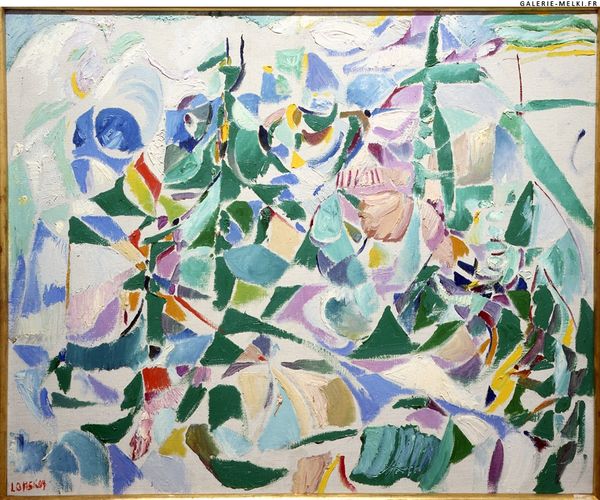 Curator: Tarsila do Amaral created "The Lake" in 1928, using acrylic paint on canvas. It’s a modernist landscape painting currently held in a private collection. Editor: My initial impression is one of almost childlike wonder. The colours are muted yet vibrant, and the forms are so simplified that they feel dreamlike. Curator: Indeed. There's a certain artlessness to the forms. I'm particularly interested in the use of acrylic, allowing her to achieve that flat, matte finish, so distinct from the oil paintings of that period. It's so smooth, giving a machine-like quality, very modern. Editor: I agree. But consider the iconography. That central blue figure, almost swan-like, could represent a deity or spirit overseeing this land. The simplified plants almost seem to possess symbolic meanings beyond mere representation. And I also notice that the use of pink on what appears to be a tree on the right, which provides the touch of vibrancy to the scene and helps to set the theme to almost a childlike setting. Curator: Interesting point. I see a tension between her modern approach to materials and production, like that smooth paint surface. And the work contains social commentary related to her work within the anthropophagy movement in Brazil, that's very much in contradiction with such interpretation, since anthropophagy calls for consuming other's culture. She is literally applying layers on top of each other. Editor: I think the simplified, rounded forms are less about direct critique, but are more to suggest this synthesis through symbolic reduction. I see in "The Lake" the artist is making something universal from very distinct sources and her imagery helps this along. Curator: Perhaps the use of industrial paint allows a certain flattening of experience and culture? I cannot imagine how challenging that would be considering the limited accessibility of paints that this artists, perhaps, could access at that time and what those limited choices implied for production and availability of that supply to other contemporary artists at the time. Editor: I believe you have changed my initial impressions here. Thanks to the cultural materials she chose as an influence and how this would then imply this process of 'flattening', in order to have something consumed or accessible at scale for the modern movement, does say a lot. The forms, colours, the material - they each contribute to something simultaneously innocent and insightful.