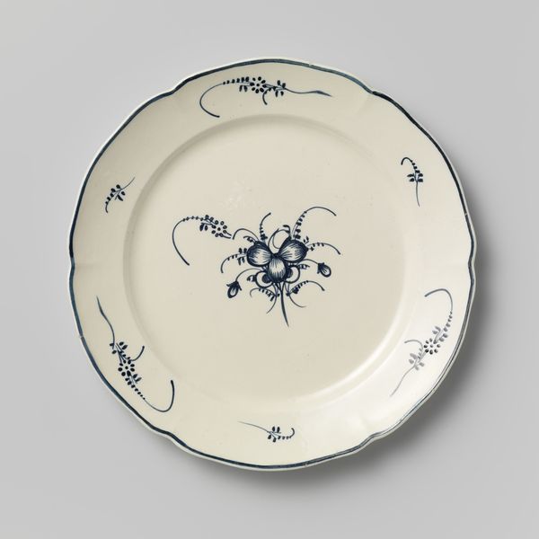 Curator: Let's discuss this plate from Boch, dating from around 1775 to 1810. The simple floral design is quite charming, don't you think? Editor: It is. This "Bord van Engels hardgebakken aardewerk, Boch faience fine" – that's a mouthful – feels so delicate despite being made of earthenware. How would you approach analyzing a piece like this? Curator: I’d focus on the materiality. The term "faience fine" itself indicates an attempt to elevate earthenware, to mimic the more refined qualities of porcelain. Look at the scalloped edges and the blue decorations – they demonstrate specific labor processes. Who was creating these designs and how was the labor divided? Was this individualized work, or factory produced? Editor: That makes me think about accessibility. Was this sort of pottery something for the wealthy, or was hard-baked earthenware allowing more people access to finer tableware? Curator: Precisely! Consider the social context: were these designs attempting to imitate luxury goods? How did the industrial processes influence its production? And how does it relate to consumption patterns during the late 18th century? Understanding the process of making and marketing these wares tells us more about how craft shifted toward industry at this time. The glaze is an important component: understanding what was used and the process in itself tells of its quality of make. Editor: So, beyond just admiring the floral pattern, we're actually looking at evidence of a changing society, through examining the means of production. Curator: Exactly! And understanding how materials, production methods, and intended consumers shaped its creation allows us to see the art more profoundly and situate its social relevance within broader market developments of its time. Editor: I never thought about analyzing ceramics this way before. Thank you. Curator: My pleasure! Materiality opens up a lot of interesting questions.