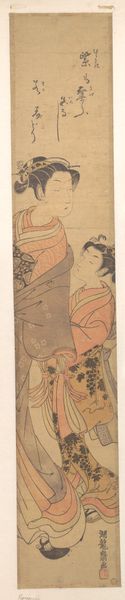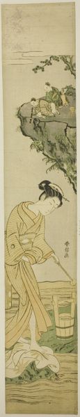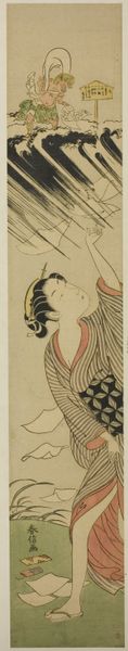 Torii Kiyomitsu created 'Chasing Fireflies' using woodblock printing, a technique deeply rooted in Japanese craft traditions. The process begins with a key block, carved to define the image’s outlines. Subsequent blocks are then used to apply colors, one at a time, building up layers of tone and texture. Notice how the flat planes of color create a sense of depth, and how the lines articulate the figure's delicate features. Woodblock printing was not only a skilled craft but also a commercial enterprise. This print would have been produced in multiples, making art accessible to a wider audience. The very act of its creation is thus tied to broader issues of labor and consumption in the Edo period. Paying attention to these materials, making processes, and cultural context allows us to understand how these prints played a role in shaping society. It challenges the traditional distinction between fine art and craft.
