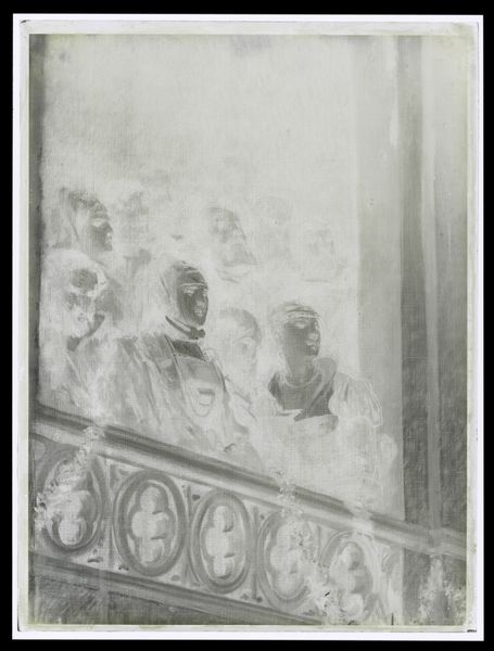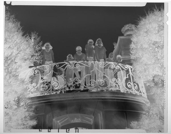 Editor: This photograph by Martin Schweig, simply titled 'Untitled,' captures nine children on a balcony. The inverted tones create an ethereal feel. How would you unpack its visual structure? Curator: Note how the wrought iron, with its spiraling motifs, competes with the figures. The formal arrangement of the children, coupled with the strong horizontal line of the balcony, establishes a fascinating tension. What does this tension suggest to you? Editor: Perhaps a contrast between the rigidity of social structures and the fluidity of childhood? Curator: Precisely. Consider also the texture – the rough foliage against the smooth stone. The photograph is rich with such dichotomies. It asks us to consider the interplay of form and content. Editor: I'm starting to see how the formal elements contribute to the overall meaning. Thank you! Curator: Indeed. A close reading reveals how much the artist communicates through the image's structure.