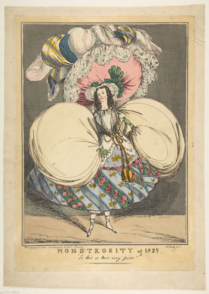 Curator: James Gillray produced this print, “Enter Cowslip with a Bowl of Cream," in 1795. The piece is a colored engraving with some colored pencil work. Editor: It has a whimsical, slightly unsettling quality to it. The figure's exaggerated proportions are quite striking. Curator: Gillray was known for his caricatures, often poking fun at social and political figures of his time. The print, held here at the Met, likely draws its inspiration from the theatre—you can even see the words “vide Brandenburg Theatricals”. What is your take on that? Editor: Given the period, I am drawn to consider this within the context of shifting gender roles and societal expectations. The text itself emphasizes masculine versus feminine, in relation to Cowslip herself. The artwork, seemingly simple, invites deeper questioning regarding gender identity. Who was the depicted person and did they cross-dress in theatre or outside the theatrical stage? What did it mean for someone to portray that gendered persona? It's like the artist wanted to deconstruct traditional stereotypes. Curator: Interesting observations! It’s all there in the artistic techniques at work here, too. Notice how Gillray used line and color to amplify the already distorted figure, achieving a striking effect. Think about the choices inherent in choosing the printmaking technique as a mean of making this image available to wider audience. The print’s satirical edge allowed him to reach a broader segment of society and expose hidden inequalities or social oddities. Editor: Absolutely. We see here a clever dialogue between medium and message. The character almost floats because she appears larger-than-life; a figure constructed within a societal lens. Even the bowl of cream takes on symbolic meaning. It feels incredibly modern in its interrogation of normative categories and behaviours, wouldn't you agree? Curator: To a point. Gillray’s access to materials such as engraving plates and quality colored pencils allowed for relatively mass production, disseminating his critical viewpoint efficiently across late 18th-century London and beyond. So many people could literally purchase and trade such commentary. Editor: Considering our discussions today, I am going to ponder on how caricatures acted as tools of subversion within the political discourse of their period. I wonder how the audience in London would interpret it in the 18th century and how we, modern spectators, reflect on such image? Curator: Yes. Analyzing the piece through the lens of the work and labor involved in its creation reveals layers of social commentary that can challenge how we see the artwork today.