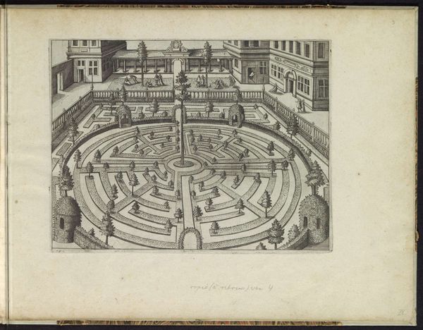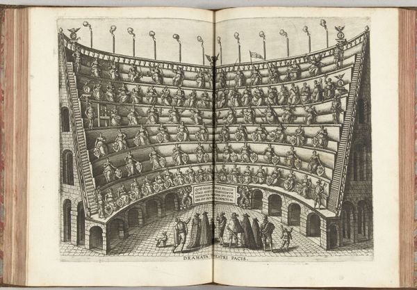 Curator: This engraving presents the anatomical theatre of Leiden University. Produced between 1610 and 1644, the print captures not just the space itself but the spectacle of early modern anatomy. Editor: It’s a fascinating composition, quite theatrical. The way the tiers of onlookers circle the central table creates a sense of depth and almost dizzying perspective. All that linearity gives the impression of… rational investigation, I suppose. Curator: Indeed. Anatomical theatres were crucial sites for the advancement of medical knowledge but were also imbued with social and political meanings. The theatre served as a public demonstration of power, both intellectual and civic. Notice how skeletons and animal remains adorn the space? Editor: They’re incredibly lively! These macabre details seem almost playful amid the grim business that’s suggested, don't they? They create rhythm and a very unique spatial dimension that defies our usual assumptions about scientific inquiry. Look at that light streaming from the upper window – it catches those skeletal forms just so, doesn't it? Curator: The display of skeletons served as a "memento mori", reminding viewers of mortality but also reinforcing the social order through scientific authority. The theatre normalized the dissection of human bodies. Anatomy thus helped solidify an intellectual hierarchy and demonstrate the power of empirical knowledge in that particular period. Editor: But even within the regimentation, that strong perspectival pull of the image and line of sight does bring it all to life. I am struck at how art manages to elicit that blend of wonder, rational ordering and human vulnerability so well! Curator: Swanenburg’s rendering is an impressive example of how knowledge, art, and authority converged in the early 17th century, framing an emergent empirical epistemology in Northern Europe. Editor: Indeed, reflecting on it, the interplay of formal arrangement with macabre details is quite brilliant, really!