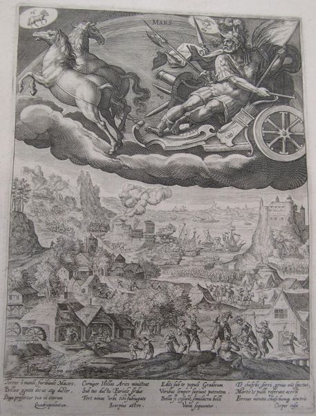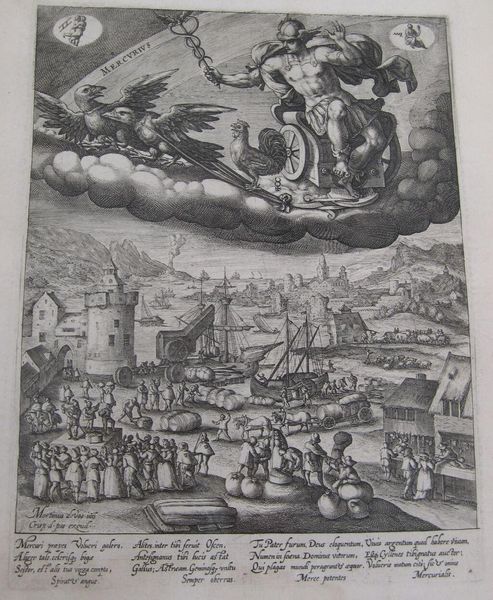 Editor: This is "The Moon" by Crispijn de Passe, made sometime around the late 16th or early 17th century. It's a detailed print, and I'm struck by how it juxtaposes the celestial with the terrestrial – the moon goddess overlooking a bustling harbor scene. What do you see in this piece? Curator: I see a potent commentary on power and influence, framed within the context of its time. The moon, often associated with femininity and cycles, literally presides over a scene of commerce and labor. It suggests a link between the lunar cycle and the rhythms of daily life, but also alludes to the patriarchal structures influencing those rhythms. The goddess's detached gaze raises questions about who benefits from this system and who is exploited. Editor: That's a fascinating point. I hadn’t considered the power dynamics at play. Curator: Consider how classical imagery was often used to legitimize social hierarchies. Does this print reinforce those hierarchies, or does it subtly critique them by placing the goddess in a position of detached observation? Editor: I hadn't thought about it that way. It’s making me rethink the whole composition. Thank you!