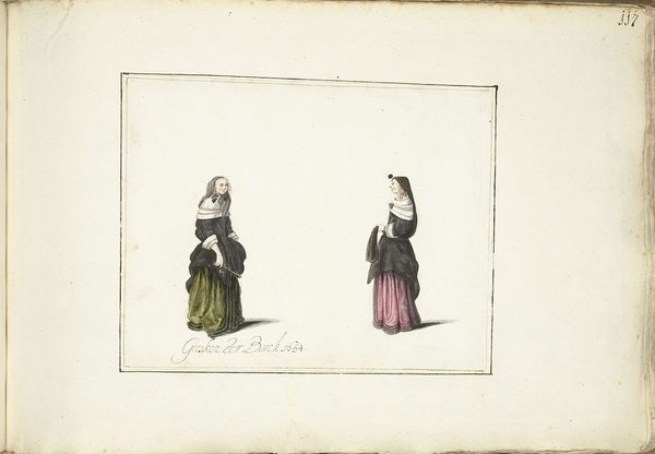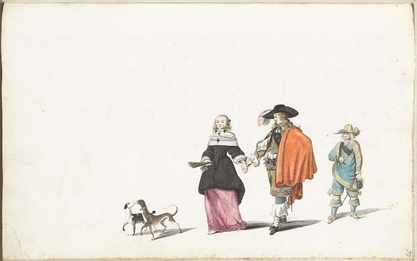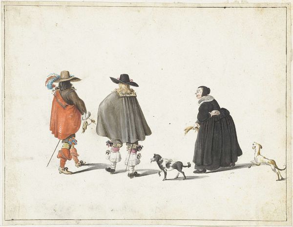Editor: This is a watercolor drawing by Gesina ter Borch, made around 1646 to 1654. It's titled "Four Children relieving themselves and three standing Women". The two scenes are on the same sheet. The subject matter is… surprising, and the coloring is so subtle. What do you see when you look at this piece? Curator: I'm intrigued by the clear visual distinction drawn between the two groupings, even as they co-exist on the same page. Consider the treatment of space, for instance. In the children's scene, a flat, almost stage-like area is created, whereas the women are given no grounding at all. The children are earthbound, we might say, and the women are, well, simply present. Editor: So, that compositional choice could speak to a separation of experience between childhood and adulthood? Curator: Precisely! And notice also the handling of the watercolor. The children are rendered with a kind of soft, almost smudged quality, particularly around their forms. This contrasts sharply with the linear precision used to delineate the women’s clothing. It is a differentiation achieved purely through formal means, wouldn't you agree? Editor: I see what you mean. The clothing really defines the women. Whereas, the children seem almost like…blobs of color. Curator: Observe, too, how the colour palettes reinforce this separation. Muted earth tones dominate the children's scene. Beside it we see brighter reds and blues in the women's attire, establishing visual autonomy between the two discrete spaces on this one page. We begin to appreciate a work operating purely on the structural contrasts that define it. Editor: That's fascinating, noticing how the colours and textures work separately, yet together. Thanks! Curator: A rewarding exploration. I've truly valued revisiting the subtleties embedded in this diptych page through formal visual means.