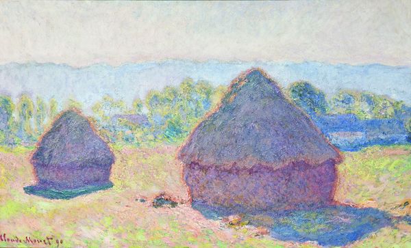 Curator: Standing before us is Claude Monet's "Haystacks, end of Summer," painted in 1891. An oil painting which forms part of Monet’s Haystacks series, showcasing the same subjects under varying conditions of light and atmosphere. Editor: It's undeniably beautiful. The gentle blues and golds create such a peaceful, almost hazy atmosphere. I find myself immediately drawn to the texture implied in the haystacks themselves – they seem almost to vibrate with light. Curator: The "vibration" comes from Monet’s masterful use of plein-air technique, moving out of the studio to document these forms en plain air. Let's not overlook that this reflects agricultural labor, it connects the rhythms of rural life to art production in its choice of subject, doesn't it? These fields would be the economic foundations of rural communities. Editor: True, but the form is also remarkable. Look how the composition leads the eye—from the larger, closer haystack to the smaller one in the distance, and then to the suggestion of the village beyond. There's a wonderful depth of field, a play of receding planes and muted tonalities which lends it a quiet grandeur. The texture makes one want to look even deeper within. Curator: Consider the context. The late 19th century witnessed rapid industrialization and urbanization. Paintings like these, although seemingly bucolic, reflect a nostalgia, maybe even an idealized view of agricultural life in contrast to increasing mechanization. It may remind us of the transition of a rural labor, through an artistic perspective. Editor: I can’t deny the historical setting. However, I also think there's something very elemental here—almost abstract in its simplicity. Those pyramidal shapes of the haystacks contrast softly with the amorphous, indefinite background. There is structure which feels both solid and evanescent simultaneously. Curator: I am just curious to what extend was he concerned with these transitions in the social construct and material conditions. Perhaps the material wealth generated in this industry made these kind of artworks attainable, to even reflect on them from afar? The means of artistic production are inevitably interwoven with economic realities, what do you think? Editor: Perhaps so. It could very well be the point from which this scene gains that nostalgic essence that permeates this piece. But isn't it wonderful how an artwork can evoke such different responses? The interplay of formal elements creates a contemplative experience regardless of the specific historical context we place it in. Curator: Absolutely. Ultimately, it reflects not only the artist's observation but our own understanding of the artwork's creation within the landscape of its time. Editor: Indeed, whether drawn to the social narrative or the formal elegance, it is undeniable the artwork encourages thoughtful contemplation.