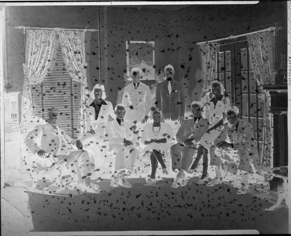 Editor: This is "Untitled (studio portrait of family)" by Hamblin Studio. It's a silver gelatin print, roughly 10 by 8 inches. The inverted tones create an eerie atmosphere. What formal elements stand out to you in this piece? Curator: The composition is rigidly symmetrical, bisected by the central male figure. Note the tonal arrangement, how the lightest areas draw the eye upward toward the backdrop, with soft, indistinct shapes resembling foliage. Editor: So, the symmetrical structure and tonal contrast are key to understanding the image's impact? Curator: Precisely. The photograph relies on these formal devices, creating a visual order that both intrigues and, as you noted, perhaps disturbs. Editor: I see how focusing on those elements reveals the careful construction of the image. Thanks for the insight. Curator: A keen observation. Paying attention to form allows us to appreciate the meticulous nature of the image.
