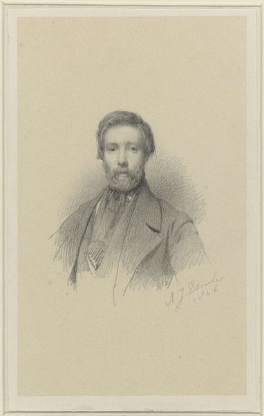 Curator: Upon observation, the drawing evokes a somber stillness, a man caught in a reflective pause. There’s a quietude in the gray tones. Editor: Indeed. We're looking at "Portret van Jacobus Everardus Josephus van den Berg" by Johann Wilhelm (I) Kaiser, rendered in pencil around 1847. It's part of the Rijksmuseum collection. The subdued nature likely mirrors the prevailing aesthetic and social atmosphere. Curator: Notice how Kaiser masterfully employs the subtle gradations of graphite. The face emerges through layered strokes; see the way he suggests the light catching the brow and the soft modeling of the cheek? It speaks to form through tone. Editor: Absolutely. The choice of medium, however, speaks volumes about accessibility. Pencil sketches, like this, would have broadened participation in image-making beyond commissioned oil paintings. Curator: And the composition is deceptively simple. The artist's manipulation of depth— the focus on the face against the softer body. A true study in figure-ground relationships. Editor: I wonder about the portrait’s function. Was it a study for a larger work, a gift between acquaintances, or perhaps a preliminary character study? Who was van den Berg? How does this image contribute to how society remembers or constructs his image? Curator: Van den Berg’s personality seems almost muted by the texture. You feel his form before any emotion. Note the materiality. The slight tooth of the paper. These characteristics speak to a raw and fundamental level of aesthetic exploration. Editor: In examining a work such as this, it is imperative that one seeks to decode its political nature and its cultural setting—recognizing the effect this may have upon even this artwork's subtle composition, and even how those impact our current viewing experience. Curator: Ultimately, Kaiser’s "Portret van Jacobus Everardus Josephus van den Berg" offers us a quiet dialogue with technique, tone and materiality. It gives a profound yet subtle meditation on the very substance of form. Editor: Agreed. Viewing this, it opens many historical contexts which allows the study and better understanding of that time. I’m compelled to do my research to determine more details of what lay in that specific period.