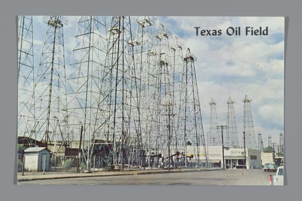 This anonymous image shows an oil field in Signal Hill, Long Beach, California, and it’s made with what seems to be a photographic printing process. The mark-making is all in the capture, the photographer framing this strange collision of nature and industry. The colors are striking. A really blue sky, puffy white clouds, and then the repetitive, insistent verticals of the oil derricks. They seem to have been set down with a limited palette, a thin wash, that allows the white of the paper to show through. Look at the way the details blur, especially in the background. It’s almost as if the scene itself is unsure whether it wants to be there or not. The overall impression is kind of haunting, like a dream of extraction. Think about someone like Bernd and Hilla Becher, who were also interested in industrial landscapes, but with a cooler, more detached eye. This image, though, has a kind of yearning to it, like it's caught between beauty and destruction. Art’s always about seeing double, isn’t it?