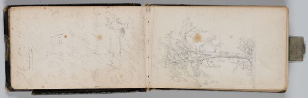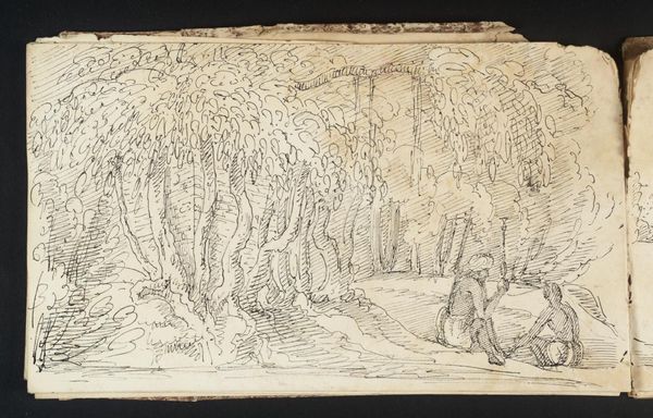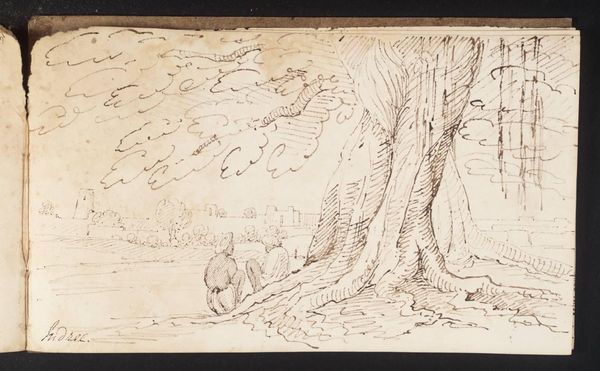 Curator: Here we have "Man naast boom," a pencil drawing on paper created by François Joseph (II) Pfeiffer in 1817. What’s your first take on this sketch? Editor: It's giving me this hushed, almost secret feeling, like I've stumbled upon a scene in a fairytale forest. There's a lone figure contemplating a colossal tree...a moment suspended in time. It's rather beautiful. Curator: Indeed, it encapsulates the Romantic era's fascination with nature and the sublime. Considering the time and place, I find myself drawn to the paper and pencil used. Pfeiffer opted for readily available materials. What does that say about his process? Was this preparatory or a work of autonomy? Editor: It feels incredibly intimate, doesn’t it? I bet the rough tooth of that paper accepted the graphite, and allowed him to work back into the ground to add complexity of details...The very act of sketching—that immediate connection between hand, eye, and the subject. Did he maybe drag his stump or fingers to gradiate areas to define values or to enhance areas that felt less definitive in the sketch? The pencil line feels almost meditative. Curator: Precisely! This wasn't merely a landscape study. Consider how the industrial revolution began to change society then. Perhaps the "Man naast boom" becomes a representation of humankind's relationship with an increasingly threatened natural world. Editor: That’s it exactly! The lone figure, dwarfed by the tree, embodying this desire for a connection with something enduring and untouched. A sense of longing almost. Curator: There’s a fascinating push and pull, isn’t there? The materials, so humble, yet contributing to a work imbued with deeper significance, reflective of social anxieties and artistic ambitions of its time. Editor: Absolutely, It feels almost timeless—a gentle reminder that even amidst change, the human heart seeks solace in the silent wisdom of trees. It speaks volumes in whispers. Curator: A testament to how simple materials can bear complex narratives. Editor: In a sense, he uses the ordinary to capture the extraordinary.