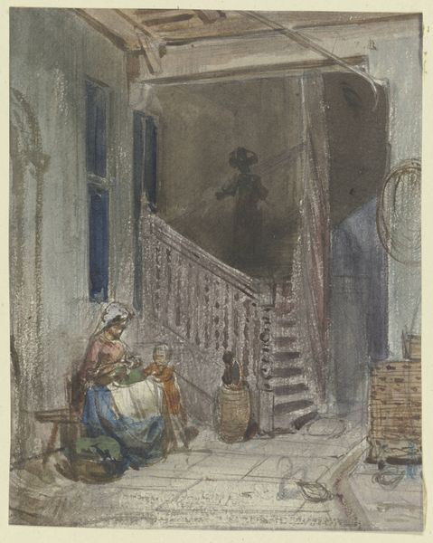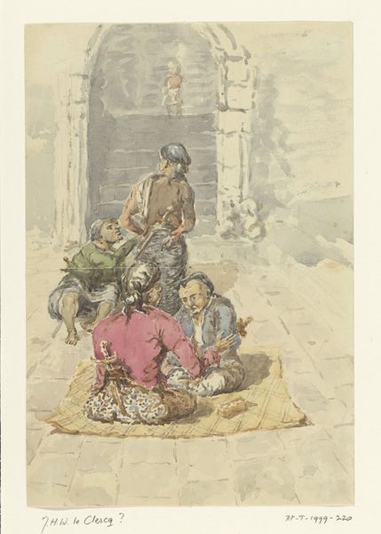 Curator: This work, created between 1870 and 1885, is "View of a Small Street in Rocca di Papa" by Willem Johann Martens. Editor: My first thought? It evokes a certain languid stillness. The light carves strong shapes, and though there's human activity, it feels very much like the environment dictates the scene. Curator: Martens, although Dutch, lived in Rome for many years. This piece exemplifies a late 19th-century trend where artists focused on realistic portrayals of everyday life in Italy, intended for consumption by tourists and wealthy collectors. Editor: The image is deceptively simple. Watercolors are difficult, requiring precise layering. He's using light and shadow, especially in the stonework, to suggest antiquity and enduring rustic values. Curator: Indeed, these genre scenes satisfied a demand for idealized, romanticized visions of Italian life. Consider the symbolism of the figures, perhaps emblematic of simple virtues appreciated at the time. It's the Italy that Northerners dreamed about. Editor: Look closer at the pig rooting about, or the hen pecking. They are not mere details; these animals signify self-sufficiency, peasant life. Also, in classical painting, pigs sometimes stood for plenty but could just as often carry negative connotations depending on context. There is a complex message here. Curator: Absolutely, Martens captures a specific moment and its attendant social context but also subtly reinforces certain political messages—ideas about regionalism and ideal communities. This would play well in urban exhibitions throughout Europe. Editor: It’s a far cry from our current media portrayals of culture. Considering its place within art history helps us understand the past, while looking at the symbols encourages reflection about today's media landscape. Curator: Precisely. And so, this small street view expands to incorporate issues of cultural projection and national image building. Editor: And to imagine how much simpler that basket-bearer's life seemed when contrasted to contemporary industrial anxiety in, say, London. I can feel the romantic longing for such rustic simplicity that Northern audiences would have projected onto that distant, sundrenched scene.