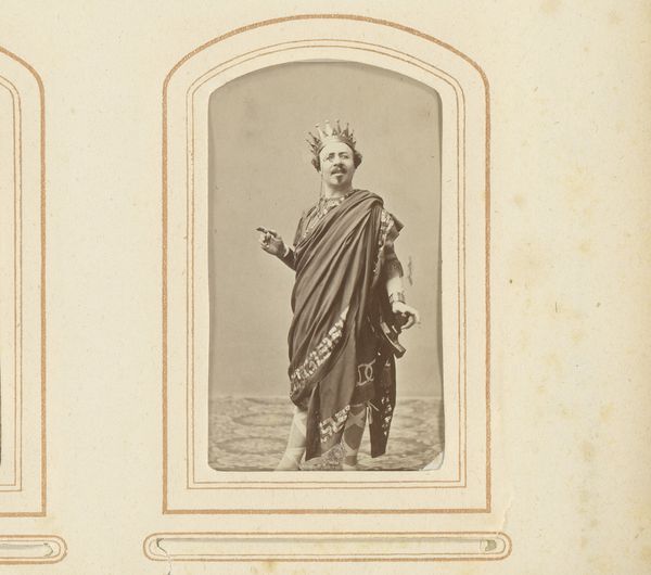 Editor: This is "Portret van een Chinese man met waaier," or "Portrait of a Chinese Man with Fan," a photograph created between 1850 and 1880 by Maujean & Dubois et Cie. The figure's posture and the column seem posed and perhaps even theatrical. What is your interpretation of this staged photograph? Curator: The theatricality you've noticed is critical. Consider the era; the West's fascination with the "Orient" fueled the popularity of Orientalism in art. The photograph presents us not with a neutral representation, but a constructed image steeped in colonial power dynamics. Editor: How so? Curator: This photograph wasn’t just capturing an image; it was participating in a specific way of seeing and framing Chinese identity. The swastika design on the robes also adds to this complexity; it had a very different meaning as a Buddhist symbol before the Second World War. What meaning was the photographer trying to evoke by displaying the symbol so prominently? Editor: That's disturbing. The photographer seems to exoticize and appropriate another culture’s visual elements for their own gain. Curator: Precisely! And, we must also be very careful with the idea of "gain." The circulation of such images reinforces a specific narrative, solidifying existing power structures and perpetuating stereotypes that strip individuals of their complexity. The subject becomes a type, a representative of an entire culture reduced to easily digestible tropes. Editor: It’s unsettling to consider the layers of meaning embedded in what initially seemed like a simple portrait. The context dramatically shifts our understanding. Curator: It certainly does. By interrogating these historical and cultural layers, we can begin to unpack the complex relationship between representation, power, and identity. The photograph functions less as a mirror reflecting reality and more as a stage projecting colonial fantasies. Editor: Thank you. It seems a "portrait" is often more than what meets the eye. Curator: Indeed, art serves as both a product and a producer of cultural narratives, shaping how we see ourselves and others.