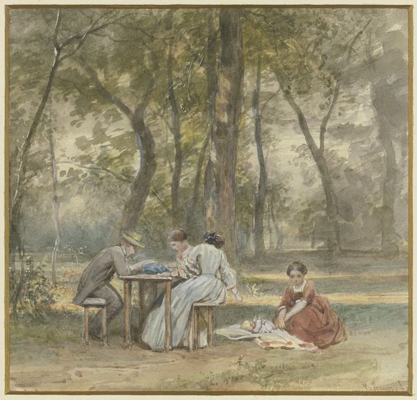 Curator: So here we have James Tissot’s "Holyday," completed in 1876. The artist worked with oil paints and employed a plein-air technique for this particular genre-portrait, which currently resides here at Tate Britain. Editor: Ah, "Holyday"! It’s as if someone bottled up the perfect autumn afternoon and just splashed it onto the canvas. Golden light, that relaxed mood... Makes me want to ditch work and join their tea party, doesn’t it? Curator: Indeed, Tissot, while active in avant-garde circles in his early years, really captured the social scene with this kind of genre painting that was gaining traction in art market during his career transition to London and shortly after his return to Paris, with these slices of upper-middle-class life. It gives us insight into their leisure activities during the late 19th century. Editor: I get a strong sense of staged spontaneity, if you catch my drift? They are clearly having "fun" but there is some form of order being imposed here, you see it even in how he presents that blanket—each utensil accounted for! Also, what about all those autumnal leaves framing them? I’d argue Tissot very cleverly draws your eye and forces you into the narrative. It all seems very conscious to me! Curator: Yes, I agree, though the seeming candidness belies the constructed nature of the composition, a common technique of "conversation piece" paintings meant to be enjoyed and discussed publicly by similar audiences. The framing of the figures by the pond and foliage gives it an almost theatrical quality; a scene from a play frozen in time. Editor: And I suspect Tissot must’ve really taken joy from representing all that fabric – look at the different patterns, the textures, the way light plays on them… Each shawl or frill tells a story! And that almost daring placement of the picnic blanket so near to that edge—it practically invites you to partake in their gathering! Curator: Yes, he's attentive to details, maybe even hyper-focused on presenting textures with almost photo-realistic clarity, especially given the context of growing trends in impressionism, with emphasis in depicting changing qualities of light over details. I find his compositional precision especially evocative because these were, in some ways, a reflection on the increasing professionalization of art scene—a response to critics of modernity seeking to capture contemporary life rather than relying only historical themes. Editor: Right, capturing life as it unfolds but not *quite* as it unfolds. Like Instagram but with oil paints. Food for thought. Curator: Food, indeed, for a very well-appointed tea table! A fascinating glimpse into a specific era.