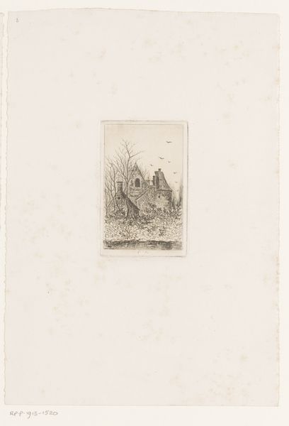Editor: Here we have "Gezicht op een kasteel," or "View of a Castle," an etching on paper by H. van Meerbeeck, created sometime between 1850 and 1913. The image is quite small and rendered in incredible detail. I find it rather romantic, with its quiet, slightly overgrown castle scene. What stands out to you, in this piece? Curator: What I find striking is the tension between realism and perhaps a slightly idealized vision of the past. We have a crumbling structure, seemingly overtaken by nature. Given the timeframe, I'd say this image participates in a broader European nostalgia for the medieval era, visible in architecture, literature, and the fine arts. The etching technique lends itself beautifully to capturing textures—stone, foliage, the stillness of the water. Editor: Nostalgia is a great word for it. Was there something particular driving this romanticization of the past? Curator: Industrialization was rapidly changing the social landscape, leading many to reflect on a perceived simpler, more virtuous past. Scenes like this provided an escape, a picturesque vision contrasting sharply with urban realities. Consider, too, how prints like these would have circulated. Who was buying and collecting these images, and what did they represent to that audience? This "castle" isn't necessarily about accuracy, but about conjuring a feeling, perhaps a yearning for stability amidst social upheaval. Editor: That's a perspective I hadn't considered. It's interesting to think about who owned the piece and what sort of values it reflected or supported. Curator: Exactly! And think about the very act of depiction; what does it mean to preserve a ruin, to make it an object of art? It subtly shapes our understanding and appreciation of history itself. Editor: This gives me a new lens through which to appreciate the artwork; thinking about the print's social context adds layers of meaning. Curator: Indeed. Art provides an intriguing window into societal attitudes and anxieties, a lot to discover beyond what is superficially shown.