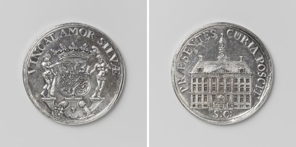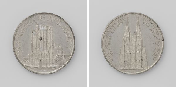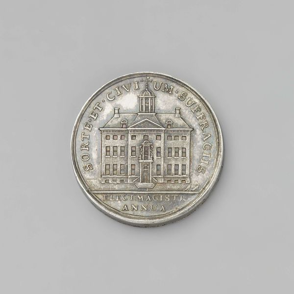 Curator: This building token from 1931, promoting the restoration of the Raadhuis in Veere, employs Art Deco principles. Notice the use of geometric patterns within the building itself, typical of the era, sharply realized in this metal relief. Editor: The overall design strikes me as particularly stoic, monumental even. The overcast palette definitely reinforces the feeling. Curator: Precisely! The symmetry of the depicted Raadhuis is meticulously crafted. The play of light and shadow is essential, highlighting the architectonic details of its stepped gables and pointed spires, achieving balance and legibility. Editor: Stepping back a little, what symbols strike you as especially relevant here? Curator: The Raadhuis itself functions as the main symbol. It signifies civic pride and historical continuity, referencing the building's crucial function in governing Veere, Netherlands. The circular format perhaps subtly gestures towards wholeness and cyclical renewal. Editor: Given it was designed to promote the restoration, one wonders, does it symbolize rebirth, or perhaps nostalgia for the town's history and past? Curator: Interesting speculation! Given the token's aim, both notions are quite present, actually. We see pride in place meeting historical importance – not just a restoration but also preservation. Editor: You know, I was originally somewhat ambivalent about the coin's lack of color, however the design makes powerful usage of gray scale. The different shadows enhance legibility. Curator: Indeed, and through that considered compositional construction, this functional token is successfully lifted into the realm of decorative art. It transcends the workaday utility it had upon conception. Editor: Looking at it one last time, what resonates is the blending of geometric abstraction and tangible architectural detail, both hinting at history and design sophistication. Curator: Agreed; the metal relief successfully creates both structure and meaning that lasts for decades beyond its manufacture.