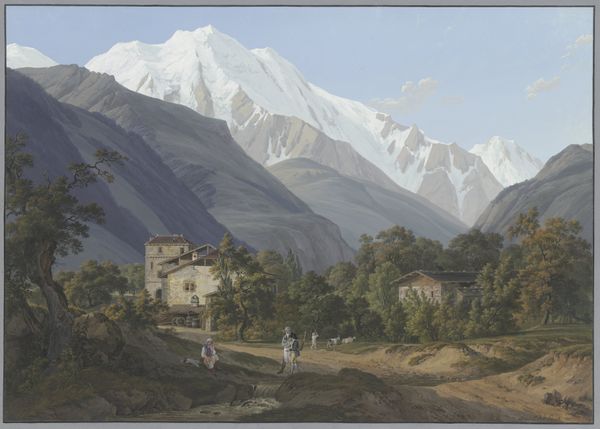 Editor: This is *Vue du Mont-Blanc prise près de Salanche*, a watercolor on paper attributed to Jean-Antoine Linck. It certainly captures the majesty of the mountain, but also something very intimate with the foreground detail. What strikes you about this piece? Curator: Immediately, I see the interplay between the sublime and the quotidian. Mont Blanc looms, an archetypal image of nature's power. But, note how Linck subtly incorporates the symbols of pastoral life. What emotions does that juxtaposition evoke for you? Editor: A sense of perspective, perhaps? Like the vastness doesn’t negate everyday life. Are the figures or animals symbolic at all? Curator: Precisely! Consider the shepherds, the resting travelers. They’re tiny, yes, yet their presence suggests a cultural memory, an ongoing narrative of humanity dwarfed by but also intimately connected to this landscape. Notice, too, how the winding path mirrors the river, suggesting the journey of life flowing toward an unknowable future represented by the mountain’s peak. Do you see parallels in other Romantic landscapes? Editor: Definitely, I am reminded of Caspar David Friedrich, with a touch of topographic detail. But this feels warmer, somehow. More welcoming, despite the imposing mountain. Curator: Perhaps that's Linck inviting us not merely to observe nature, but to inscribe ourselves within its unfolding story, find resonance within its grandeur. It reminds us of the enduring power of the symbolic in grounding us, giving context to vast, overwhelming feelings. Editor: It's fascinating how a seemingly straightforward landscape can be so rich with symbolic meaning. Curator: Indeed. It reveals how visual symbols subtly inform our understanding and memory of even the grandest experiences. A small pathway to a giant mountain.