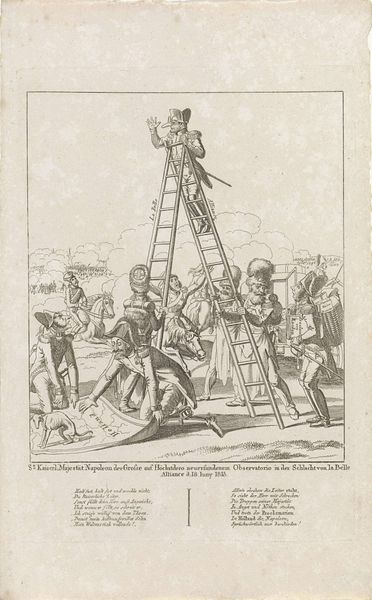 Curator: This print, titled "A man climbs a ladder while a woman throws water on him from above," was created by Giovanni Ambrogio Brambilla between 1575 and 1599. It's an etching rendered in that detailed, linear style we associate with Mannerism. Editor: My first impression is pure chaotic humor! There's so much visual storytelling packed into this one scene—a sense of imminent slapstick. The characters' exaggerated expressions only amplify the playful mood, don’t you think? Curator: Absolutely, and placing this within the context of 16th-century Italian society, one might see it as a commentary on gender dynamics and class tensions. The woman, elevated both physically and perhaps socially, literally pours scorn upon the man. His accomplice lurks, reinforcing the social disruption. Editor: The water is such a primal symbol – purification, baptism, but also cleansing as in, washing away wrongdoing, in this case failed trespass? Is the falling water meant to ‘baptize’ him? And how does it contrast with the expressions of all involved? There are clues here about moral rectitude. Curator: Intriguing idea! Certainly, water features heavily in cultural narratives across history as both destructive and restorative. Here, its application seems clearly punitive, linked directly to the woman's position of power within this tableau. It serves, symbolically, to cleanse him from his presumed transgression. It calls into question the narrative of masculinity prevalent at the time, disrupting any expectation of male dominance. Editor: Look at the text scrawled across the image. Does the act embody the symbolism of betrayal: "Amigo, Amigo" as the water drenches him, "Wait, wait, you thieving scoundrel!" it yells? In his quest, who’s betrayed him, and for what gains or purposes? The bucket symbolizes both danger and power as weapons, while that ladder is an invitation and a road towards possible upward advancement Curator: Yes! And thinking about the shield lying discarded on the ground -- could it represent discarded privilege, perhaps? That combined with the accomplice ready with a weapon creates a potent image of social conflict playing out. This seemingly humorous scene becomes quite a biting critique, using the subversion of established order to examine power dynamics. Editor: Such clever use of symbolism makes one contemplate enduring class struggles. I leave with the understanding that even humour carries layered meanings across time. Curator: Indeed! Examining art through an intersectional lens gives us a wider and more meaningful scope of history, politics, identity, and, of course, humanity itself.