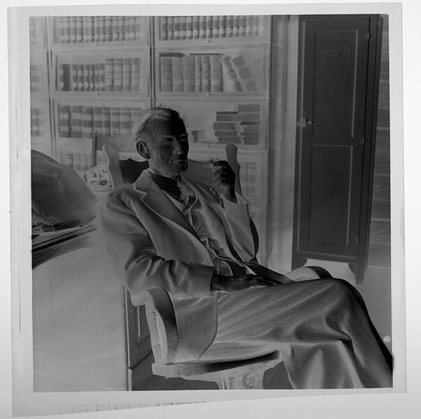 Curator: Jack Gould’s untitled photograph presents a man seated at a desk, presumably engaged in a telephone conversation. Editor: The stark contrast in this small, square print really emphasizes the weight of the man's office environment. Curator: Indeed, the composition is structured around the interplay of light and shadow, directing the viewer's eye toward the subject's contemplative posture. Editor: Considering the materiality of photography at this time, the image speaks to labor and the increasing pace of work through technology. Curator: Perhaps. But it also evokes a sense of isolation, heightened by the formal arrangement of the background elements—windows, portraits, lamp. Editor: The scale suggests this was a personal photograph, perhaps related to the subject's business. Curator: In essence, the photograph's power lies in its ability to balance the subject’s world with the materials available to construct that world. Editor: I'm drawn to the surface texture of the print itself and its documentation of a moment in work culture.