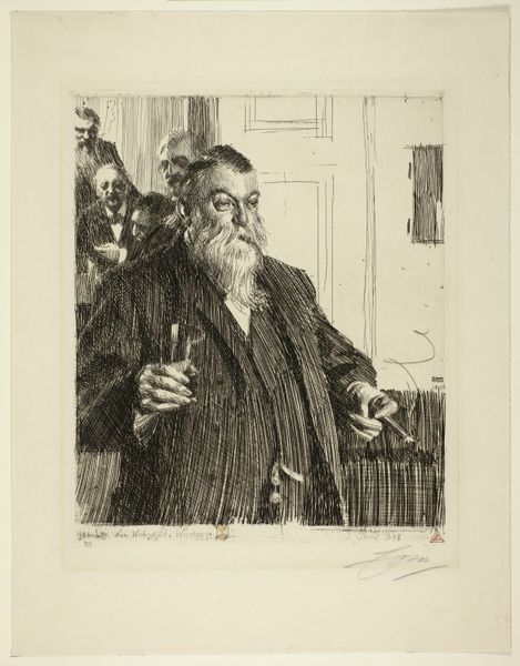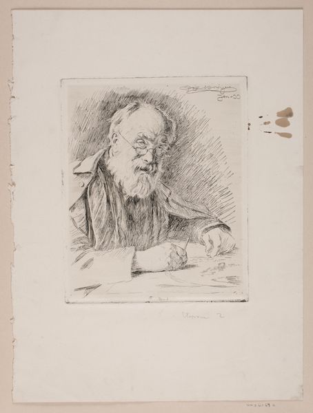 Editor: This is Anders Zorn's "Axel Herman Haig III," an etching from 1884 currently at the Art Institute of Chicago. It's incredible how much detail he achieved with just lines. What strikes me most is how the artist captures the subject's introspective mood, perhaps reflecting the creative process. How do you interpret the formal aspects of this piece? Curator: Focusing on form, one immediately notices the striking contrast. The strategic use of chiaroscuro, created through varying densities of etched lines, models the figure and contributes to a dynamic composition. The verticality of the lines in the background contrasts with the horizontal emphasis of the table, thereby framing Haig in a space that simultaneously constrains and supports his creative work. Notice also how the diagonal lines converge, drawing the eye to the central figure and creating a sense of depth within a relatively shallow plane. Does this interplay of line direction influence your perception of the subject's mental state? Editor: It definitely emphasizes his focus! The way the lines direct your gaze makes his concentration palpable. But the looseness of the lines in the background also gives a sense of a wider, maybe even chaotic, mental landscape. Curator: Precisely. The contrast between the tightly rendered figure and the more abstract background invites contemplation. It directs our attention to the tangible subject while hinting at intangible thoughts, revealing what painting lacks when stripped down to its structural components. Editor: Seeing it that way highlights how every formal choice contributes to the overall impact. Curator: Indeed. This exercise showcases how form isn't merely decorative; it’s fundamentally constitutive of meaning. Editor: Thanks! Thinking about line, contrast, and composition has definitely opened my eyes to new ways of interpreting portraiture.