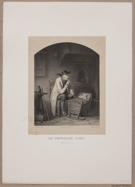 Curator: This print, entitled "Slotenmaker aan het werk", which translates to "Locksmith at Work," was created by Jean-Baptiste Madou between 1825 and 1835. It's an engraving. What strikes you most about it? Editor: It feels very... industrious. The blacksmith, framed by his tools and fiery forge, seems stoic. There is this distinct, sort of Romantic-era reverence for labor that seems to permeate the composition. It is a sympathetic depiction. Curator: Exactly. Madou was very interested in portraying the everyday lives of working-class people. These images often circulated as prints, making art more accessible to a broader public and, simultaneously, creating a sense of national identity around common professions. Editor: Did his social background influence this interest? It’s always relevant who is given the authority to depict a certain moment or certain peoples and the potential implications for the interpretation. Curator: Madou came from a relatively modest background himself. And he did seek patronage among the aristocracy and bourgeoisie by showcasing a keen understanding and empathy for these laborers. Editor: It brings up that delicate tension—highlighting working-class struggles and celebrating the nobility of work, while potentially reinforcing existing power structures. Curator: Absolutely. It's a visual balancing act. The detailed rendering gives the figure a sense of dignity. The inclusion of his tools isn’t merely decorative; they symbolize the mastery of his craft. There is the clear appreciation of labour apparent here. Editor: The lighting contributes, too, right? That almost theatrical glow from the furnace casts the artisan as a sort of Promethean figure—not just a locksmith, but a bringer of light and progress. The print isn’t purely documentary; it elevates the subject. Curator: Right, this representation definitely speaks to that era's evolving social awareness and artistic tastes, as well as new ideas and societal frameworks that began emerging within the political structures and new power hierarchies in the early to mid-1800s. Editor: Viewing it with that lens is key. Thanks for outlining all that background! I feel like I better grasp the dynamics at play in this work. Curator: It’s rewarding to view this portrait as less just a genre piece, but something speaking more broadly about its culture.