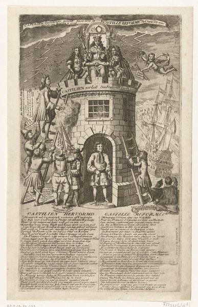 Curator: Look at this intriguing print from around 1780. It’s called "Spotprent op de oorlog tussen de Republiek en Engeland," which translates to “Cartoon on the war between the Republic and England.” The artist is anonymous, and the work currently resides in the Rijksmuseum. Editor: My initial reaction? It's chaotic, almost carnivalesque. A dense cluster of figures arranged seemingly at random, floating above lines of close-printed Dutch script! I find the contrast between the delicate lines of the engraving and the violent scene fascinating, and somehow the work has a mordant tone. Curator: Yes, the "carnivalesque" really gets at the symbolism at play. Note the Dutch lion and British lion intertwined, their struggle visualized. Above them hovers a broken English flag. It speaks to a power shift. And there's that fascinating ship with figures on top, what do you make of those figures atop it? Editor: It makes me think of shipbuilding and the networks of craftspeople who would be required to deliver it - sailmakers, rope makers, carpenters… Each component shaped individually and carefully brought together. Notice that these processes are now fully mechanized in contemporary shipbuilding: what kind of change would have been apparent at the time in which this was made? Curator: A significant shift, that’s for certain. It touches upon England’s reliance on its resources at this moment in time as well. Consider the printed words—presumably offering commentary. Such texts democratize access in a way visual imagery alone cannot, further engaging the public with the conflict's narrative and meaning. The war must have significantly disrupted existing processes and trades as well. Editor: It definitely brings out questions around the materiality of power, not just its symbolic representation. The materials for ships of war, who owns them, who profits from them? The production costs are staggering even when labor is cheap. Who could consume these prints? They must be incredibly political things. Curator: Absolutely. And from my perspective, I see it acting as an allegorical mirror, reflecting a changing European landscape where visual narratives served a crucial purpose of disseminating very potent information, whether true or only suggestive. Editor: It has helped me remember that beneath all representations is a literal process that touches workers and materials directly - there is a way this cartoon invites reflection upon labor itself!