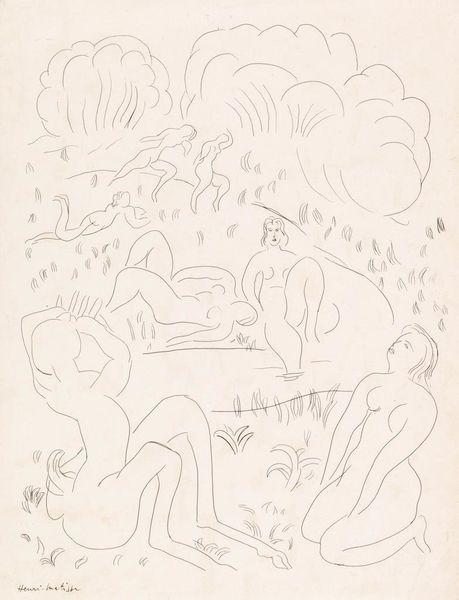Curator: This is "L'arbre de Noël I," or "The Christmas Tree I," a 1930 ink drawing on paper by Mily Possoz. What are your initial thoughts? Editor: Ethereal. Almost haunting. The lightness of the ink combined with the cluster of faces creates a really dreamlike quality. It's deceptively simple in its rendering, yet there's an undeniable complexity. Curator: Absolutely. Considering it was created in 1930, it’s important to understand the artistic landscape of the time. Surrealism was gaining traction, impacting how artists like Possoz depicted everyday scenes and subjects. This piece, despite its domestic subject, feels deeply influenced by those avant-garde ideas. Editor: And that is visible through its composition. The surreal aspect isn't immediately obvious, but look closer: we have figures juxtaposed unexpectedly around the central image of the Christmas tree, animals wandering indoors, and then, too, those disembodied figures up top like floating spirits, angels almost. All this raises questions about domesticity, performance, and identity. Are the figures real or dream representations? Curator: A fascinating point. What's really striking to me is Possoz’s manipulation of materials— the way she's employed the ink’s translucency to suggest the diaphanous nature of memory, as if all of these portraits are emerging from a collective experience, or perhaps reflecting how childhood events remain layered in one’s recollection. Editor: The repetition of figures makes me think of the role of women during this era. Note that all the faces appear to be women or girls, so the subject might reflect the enclosed nature of domestic life. Who has access to domestic spaces and labouring roles during the period—mothers, daughters? Curator: It's true that art always reflects to some degree, consciously or otherwise, its period. And for Possoz, I believe her visual language allowed her to hint at these more complex ideas of both female roles and dream worlds. It feels quite progressive for the period. Editor: In retrospect, considering the piece within this cultural and artistic context helps highlight its distinctive tone. It's more than just a charming image, it's a sophisticated interpretation of the cultural politics and family roles, subtly brought together with a fine material sensibility. Curator: Exactly, it brings us closer to the original context.
