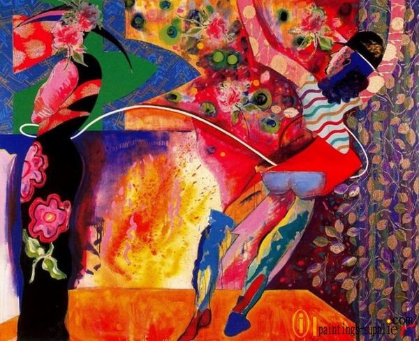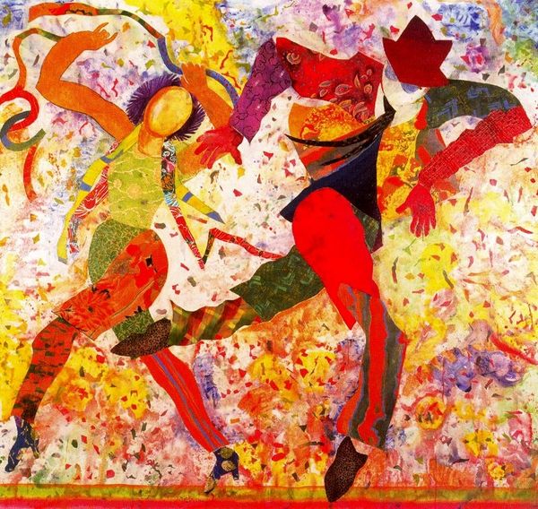 Curator: Instantly, I'm struck by the vibrant chaos of this painting. A riot of colors and figures, all vying for attention. Editor: This is "I'm Dancin' as Fast as I Can," created in 1984 by Miriam Schapiro. You’ve rightly identified its dynamism. Schapiro's style frequently combines abstract expressionism with recognizable figures and patterns, reflecting themes of women's lives and experiences. Curator: Yes, the swirling energy evokes a feeling of exhilaration, but also a hint of frenzy. I see archetypes embedded within the image: the man with the cane seems to be a ringmaster or an entertainer, but he seems slightly haunted, a little frenetic to me. It could evoke ideas related to stage fright, perhaps, and what's more it co-occurs alongside symbols like a snake. This co-occurence, especially in light of the artist, suggests narratives regarding self-discovery through archetypes from feminine history or myth. Editor: From a formal perspective, notice the layering. Schapiro used a technique she called "femmage," combining fabric, paint, and collage elements. See how the different textures play off each other—the rough fabric contrasting with the fluidity of the painted strokes. What’s most exciting here, to me, is the balance of chaos and harmony. Although seemingly disorganised, the shapes and colours ultimately converge towards a harmonious state in this private collection Curator: Ah, yes, "femmage." This is deeply important. Think of the emotional weight, of what happens when fragments are combined. Fragments represent shared symbols across personal and historical dimensions. I would suggest we contemplate how those symbols carry and generate shared meaning. Look at the roses which also come into play in this picture. In many traditions the rose refers to cycles of life and even self-transcendence! It is possible Schapiro invokes traditions about women to illustrate self-transformation from women’s art history! Editor: I'm interested by how Schapiro manipulates pictorial space and how our viewing navigates figure and ground. The overall effect of all that happens in pictorial terms strikes the right key with an emphasis on dynamic compositions in this picture from 1984. The title too indicates something in the image should represent that tension or dynamic energy to an end. This makes this particular instance, perhaps, of the female archetypes of art a particularly outstanding work to the formal viewer. Curator: For me, diving into its depths is worth remembering the stories embedded in objects, reminding me how deeply felt personal meaning can resonate outward to wider historical narratives of expression. Editor: And for me, that layered experience—both formal and art historical and archetypical as we see it—is what ultimately gives "I'm Dancin' as Fast as I Can" such compelling visual power.
