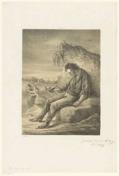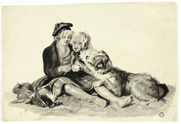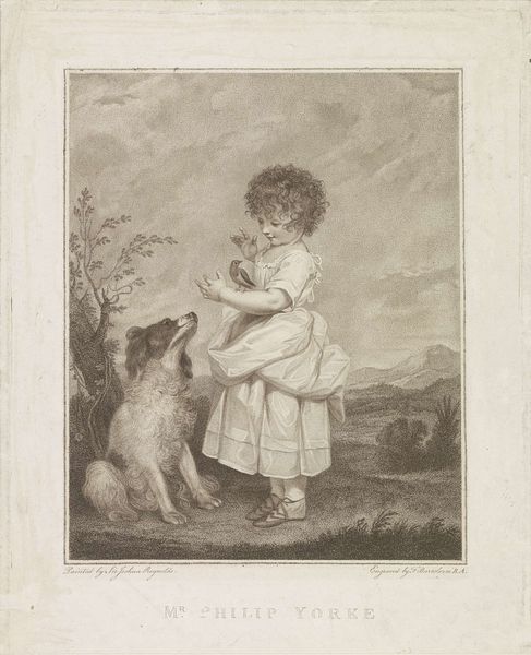 Editor: Here we have Martin Ferdinand Quadal’s "Hond en jongen," made in 1793. It's an engraving depicting a boy with his dog, and what immediately strikes me is the stark contrast between the figures and the rather sketchy background. How do you interpret this work? Curator: That contrast is crucial, and it leads me to think about the hierarchies embedded within 18th-century society. While on the surface, this looks like a simple genre scene, we need to question who had the leisure to commission such works. Are we truly seeing a celebration of the common man, or is it an idealised, even patronising, representation created for a privileged audience? Editor: That's a perspective I hadn't considered. I was focused on the apparent innocence of the scene. Curator: Exactly! That "innocence" is precisely what needs unpacking. The boy's somewhat ragged attire and barefoot state, juxtaposed with the dog’s calm pose, hint at a particular relationship. How much agency do they truly possess within the economic and social structures of the time? Is this supposed closeness to nature really just poverty? Editor: So, you're saying that instead of face-value sentimentalism, it prompts questions about social commentary? Curator: Precisely. The engraving technique, with its emphasis on line, can even be read as reinforcing the social divisions. The lines demarcate, delineate, almost categorise these figures within their assigned roles. Consider also how such imagery was circulated and consumed: who controlled the narrative then, and who benefits from these narratives today? Editor: Wow, that’s a really interesting way to look at it. I was completely missing the layers of social and historical context. Curator: It's easy to be seduced by the seeming simplicity. But by interrogating the underlying power dynamics, we can reveal a much more complex picture. I’m glad that looking together allowed both of us to think of these hidden perspectives.