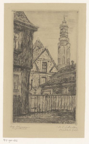 This is an etching of Beethoven's birthplace in Bonn, made by Carel Nicolaas Storm van 's-Gravesande. Born in the Netherlands, van 's-Gravesande trained as a lawyer, but became an artist later in life. His work, like this print, suggests a fascination with architecture, but more specifically, the atmospheric qualities of light and shadow. It is an intimate piece, worked in a monochrome palette. The etching process itself is fascinating. It involves coating a metal plate with a waxy ground, then drawing through it with a sharp needle to expose the metal. The plate is then submerged in acid, which bites into the exposed lines, creating grooves. Ink is applied to the plate, filling the etched lines, and the surface is wiped clean. Finally, the plate is pressed onto paper, transferring the ink and creating the print. The etched line of the image gives it a unique texture. The fine lines create a sense of depth and detail, while the overall impression is subtle and nuanced. The social context of this work is tied to the rise of printmaking as a democratic art form, making images accessible to a wider audience.