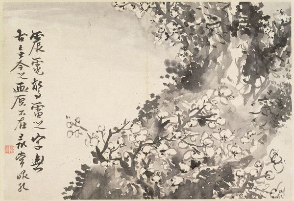 Curator: "Gathering in Mountains," created by Fu Baoshi in 1956. Editor: It's striking. The landscape looms, almost menacingly, yet that gathering of people seems completely unbothered by its scale. Curator: Indeed, the vast landscape serves as a backdrop for the small gathering, a common theme in Chinese landscape painting. Fu Baoshi was known for his innovative techniques, blending traditional ink wash with a more expressive, individualistic style. It reflects the complexities of his time, when artists were negotiating tradition and revolutionary ideology. Editor: Those figures. Do you get the sense that their placement implies resilience, maybe resistance against the overwhelming power of nature and implicitly the power structures they reflect? There’s a boldness in their quiet gathering. Curator: It could also represent the harmony between humanity and nature, a key Daoist principle, which informed a lot of landscape painting at the time. Remember, the mountain is more than a geographic feature; it is a symbol of permanence, of refuge. Editor: Symbolically, the waterfall, positioned so centrally, almost bisecting the composition... Curator: Waterfalls are very significant motifs: They represent constant renewal, transformation, and also act as conduits between different realms, joining Heaven and Earth, the tangible and the spiritual. Editor: The artist uses a limited palette – mostly black and gray washes. Does this speak to a certain austerity, perhaps echoing the political climate of mid-century China? Curator: Perhaps. It certainly limits distractions and concentrates our attention on the linework, on the dynamic tension created between light and shadow, stillness and movement, control and spontaneity. Editor: Looking again, it seems so different. At first it felt brooding, but the way the artist captures light reflecting off the waterfall...now I see glimmers of hope, possibility. It is ever changing like a landscape itself, its symbolism changes and gains nuance, shifting with us. Curator: Absolutely, and with ongoing sociopolitical interpretations. It speaks volumes.
